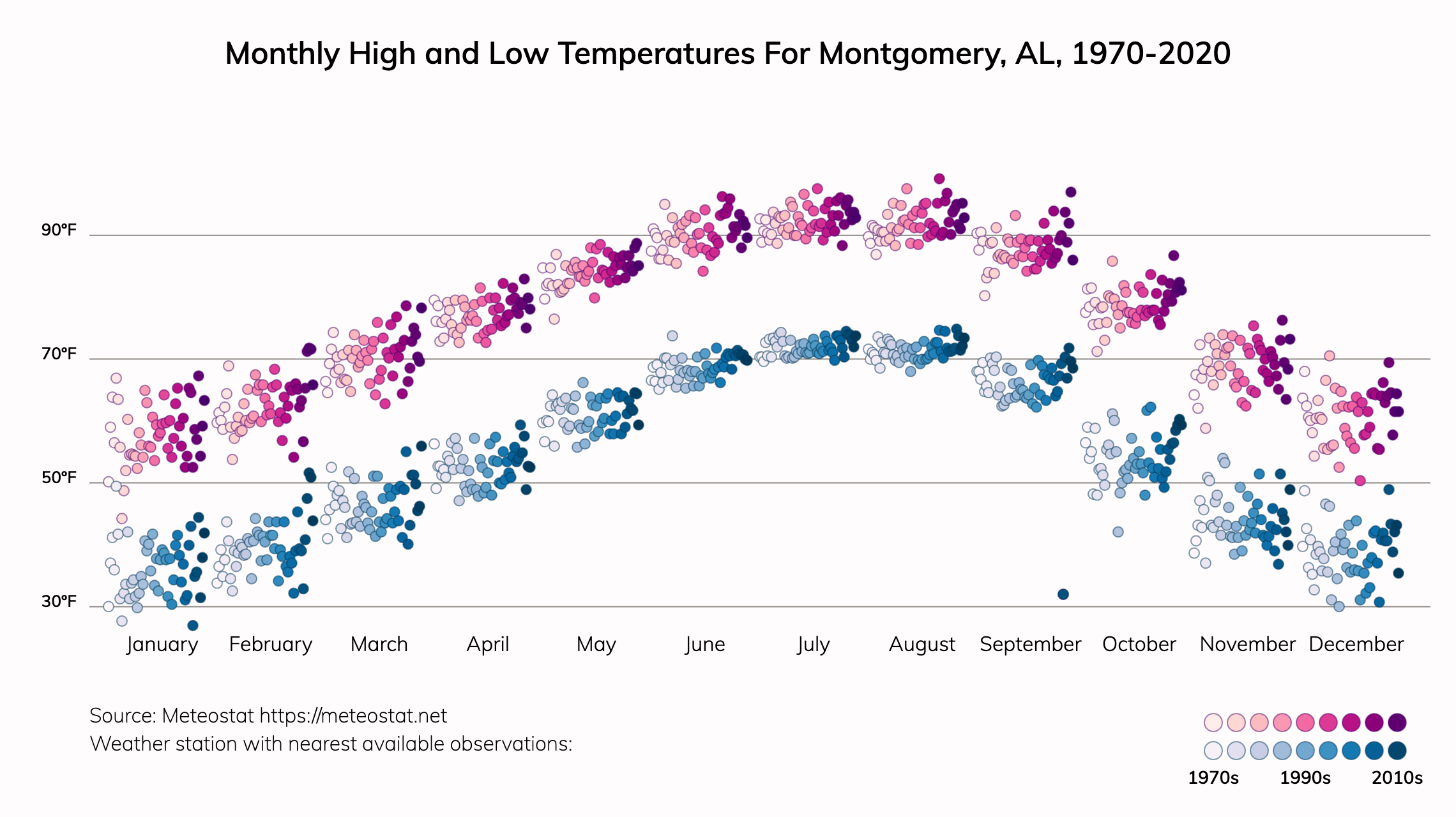 In a typical year around 1990, people in Montgomery, AL experienced about 7 days above 97.0ºF in a year. By 2050, people in Montgomery are projected to experience an average of about 53 days per year over 97.0ºF.Climate change is increasing the frequency and intensity of heat waves, even in places with cooler average temperatures. See more information on heat risk. Everyone can take steps to reduce their risks from extreme heat.