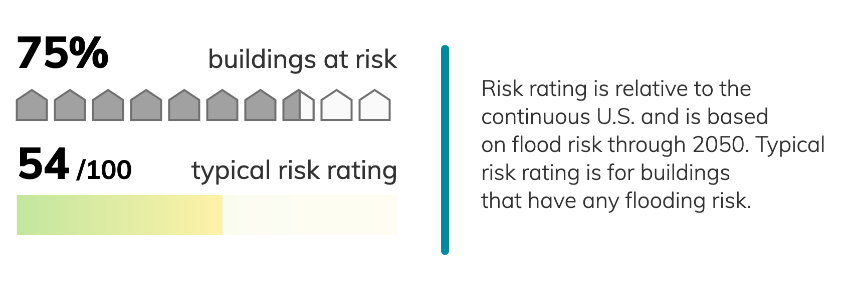 Of 190 census tracts in Scottsdale, AZ, there are 157 where more than half of buildings have significant risk from surface (pluvial) flooding and riverine (fluvial) flooding. Property owners can check a specific address for flood risk including FEMA flood zone, then take steps to reduce their vulnerability to flooding damage.Climate change is increasing inland and coastal flooding risk due to sea level rise and increasing chances of extreme precipitation. See more information on flooding risk.
