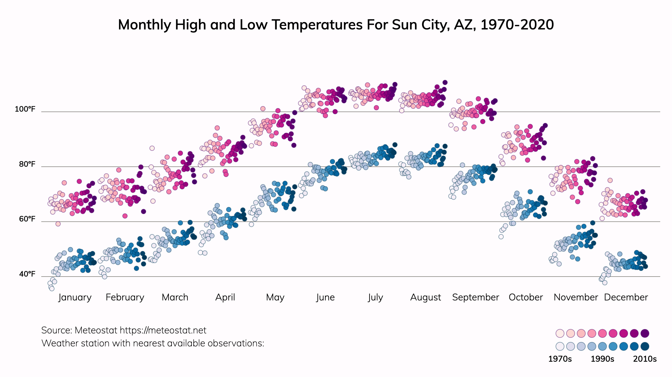 In a typical year around 1990, people in Sun City, AZ experienced about 7 days above 111.0ºF in a year. By 2050, people in Sun City are projected to experience an average of about 46 days per year over 111.0ºF.Climate change is increasing the frequency and intensity of heat waves, even in places with cooler average temperatures. See more information on heat risk. Everyone can take steps to reduce their risks from extreme heat.