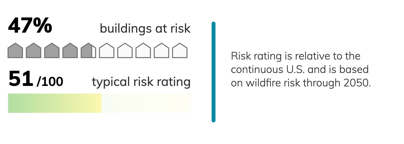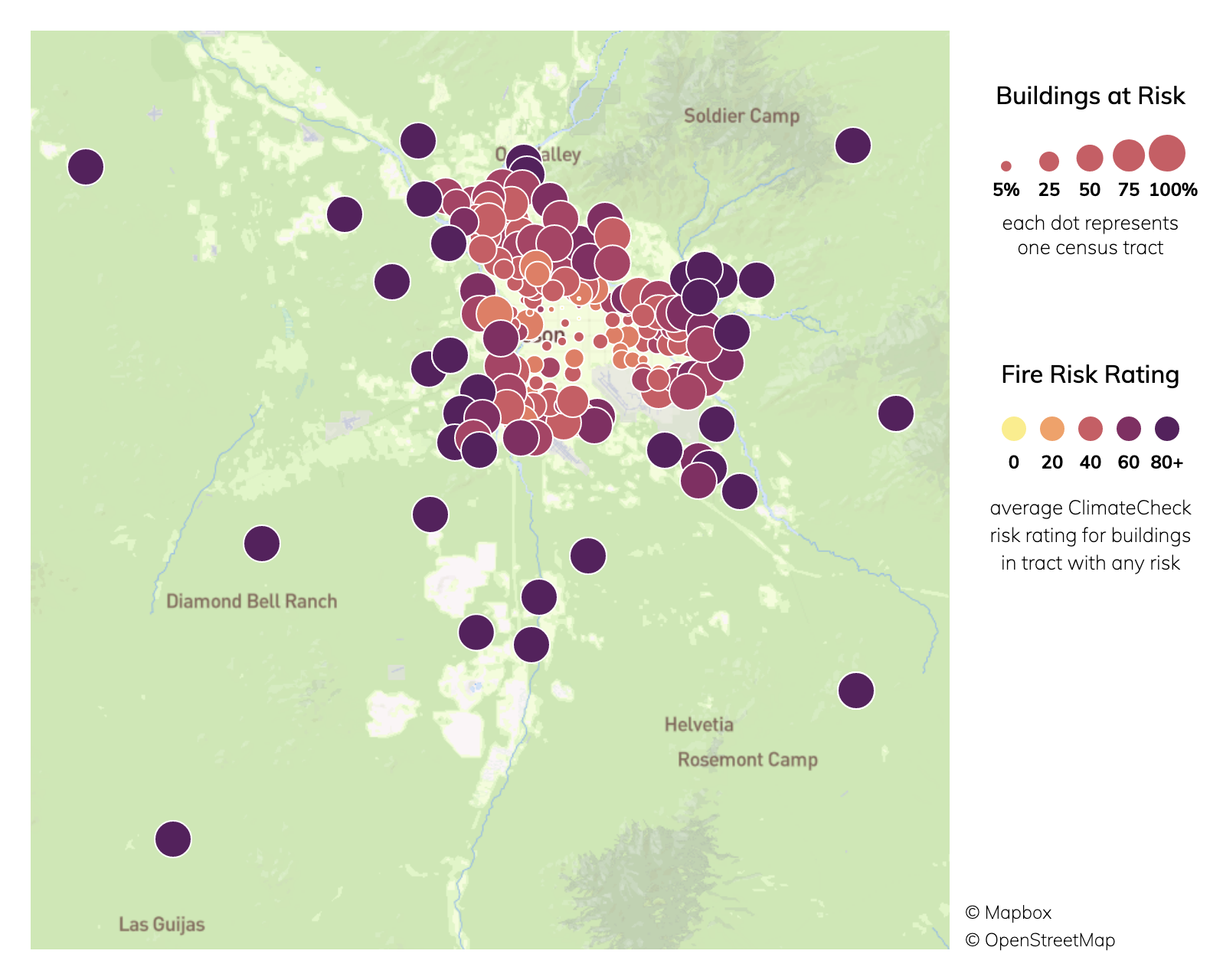 Of 320 census tracts in Tucson, AZ, there are 228 where more than a quarter of buildings have significant fire risk, and 195 where more than half of buildings have significant fire risk. Property owners can take steps to mitigate their risks from wildfires.Fire risk depends on proximity to vegation: densely developed urban areas have a much lower risk of burning than areas adjacent to wildland. Climate change increases risks from wildfire by creating hotter, drier conditions for fires to spread. ClimateCheck ratings of fire risk are based on projected weather conditions and U.S. Forest Service models simulating fire behavior.