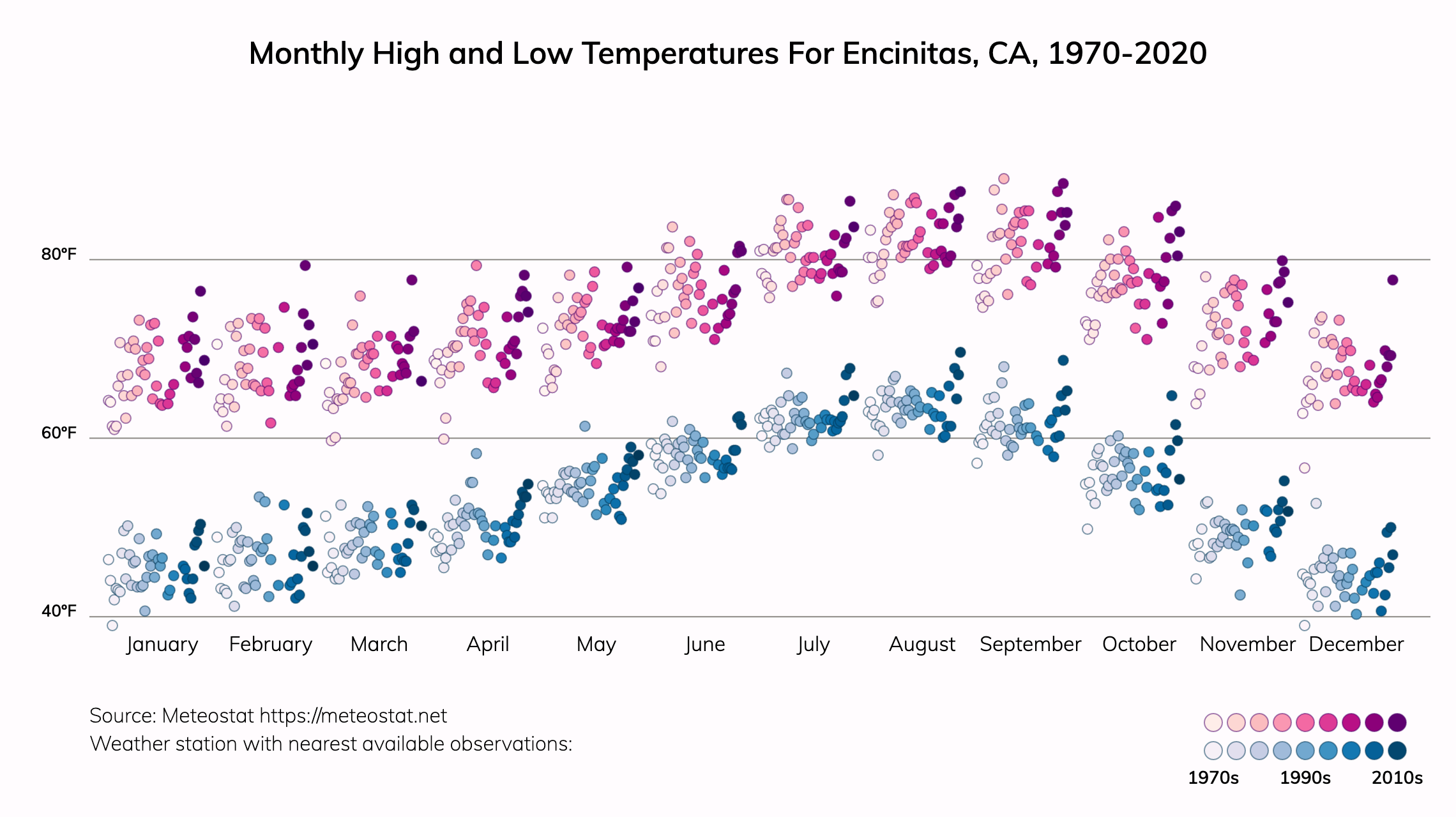 In a typical year around 1990, people in Encinitas, CA experienced about 7 days above 92.3ºF in a year. By 2050, people in Encinitas are projected to experience an average of about 25 days per year over 92.3ºF.Climate change is increasing the frequency and intensity of heat waves, even in places with cooler average temperatures. See more information on heat risk. Everyone can take steps to reduce their risks from extreme heat.