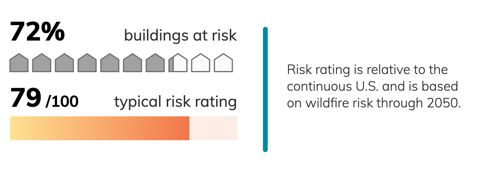 Of 98 census tracts in Escondido, CA, there are 79 where more than a quarter of buildings have significant fire risk, and 79 where more than half of buildings have significant fire risk. Property owners can take steps to mitigate their risks from wildfires.Fire risk depends on proximity to vegation: densely developed urban areas have a much lower risk of burning than areas adjacent to wildland. Climate change increases risks from wildfire by creating hotter, drier conditions for fires to spread. ClimateCheck ratings of fire risk are based on projected weather conditions and U.S. Forest Service models simulating fire behavior.