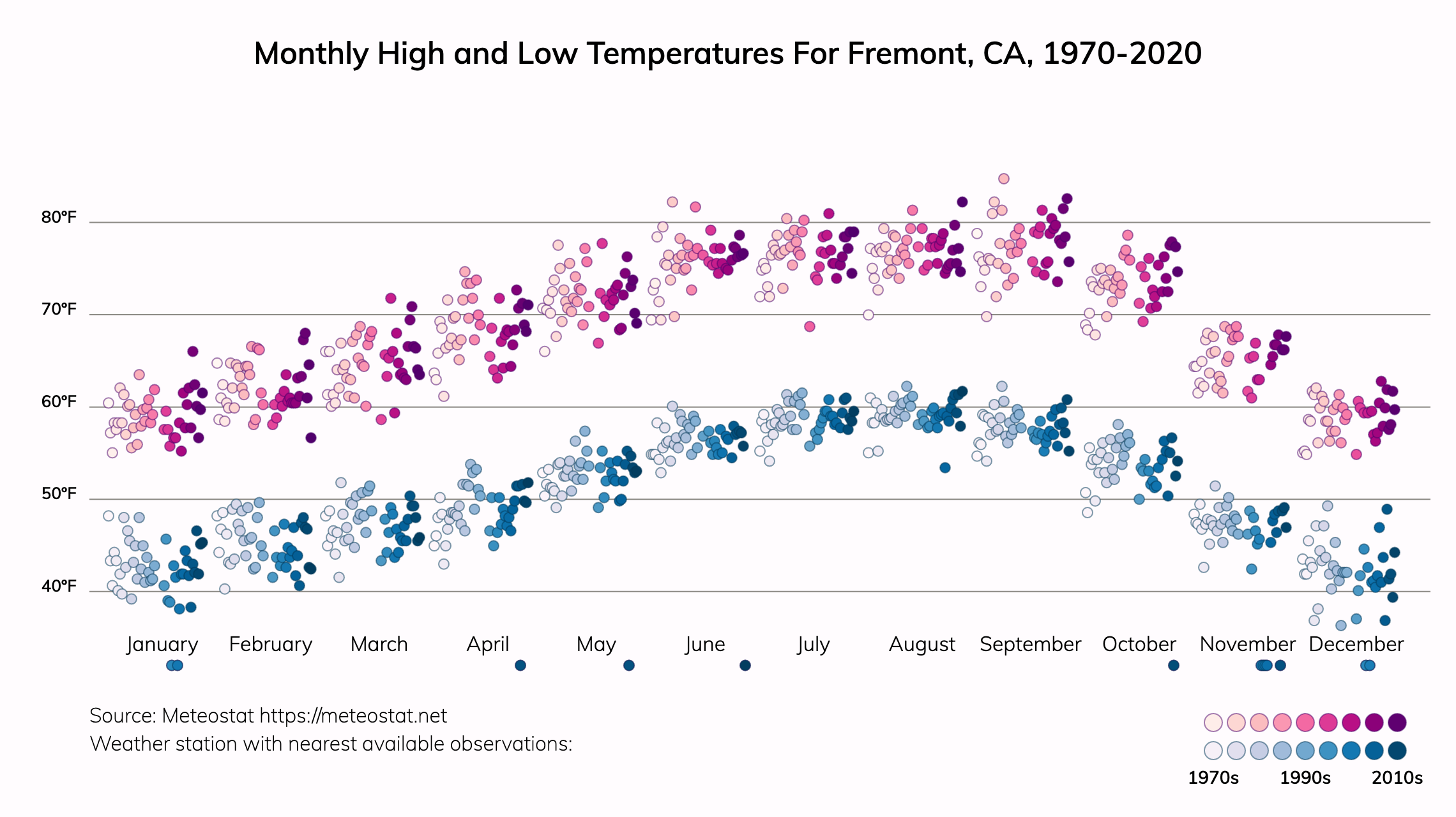 In a typical year around 1990, people in Fremont, CA experienced about 7 days above 89.7ºF in a year. By 2050, people in Fremont are projected to experience an average of about 20 days per year over 89.7ºF.Climate change is increasing the frequency and intensity of heat waves, even in places with cooler average temperatures. See more information on heat risk. Everyone can take steps to reduce their risks from extreme heat.