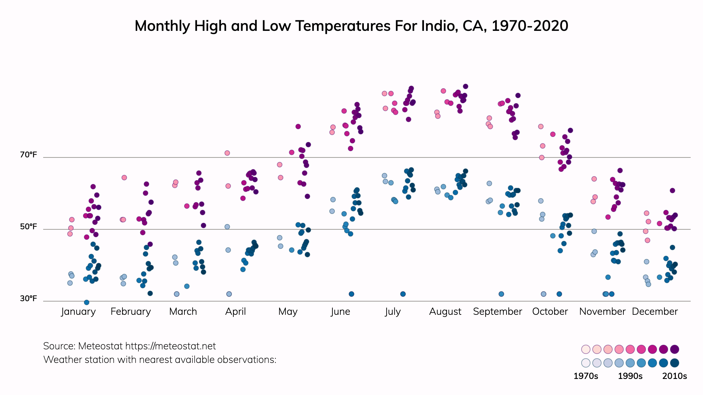 In a typical year around 1990, people in Indio, CA experienced about 7 days above 112.0ºF in a year. By 2050, people in Indio are projected to experience an average of about 33 days per year over 112.0ºF.Climate change is increasing the frequency and intensity of heat waves, even in places with cooler average temperatures. See more information on heat risk. Everyone can take steps to reduce their risks from extreme heat.