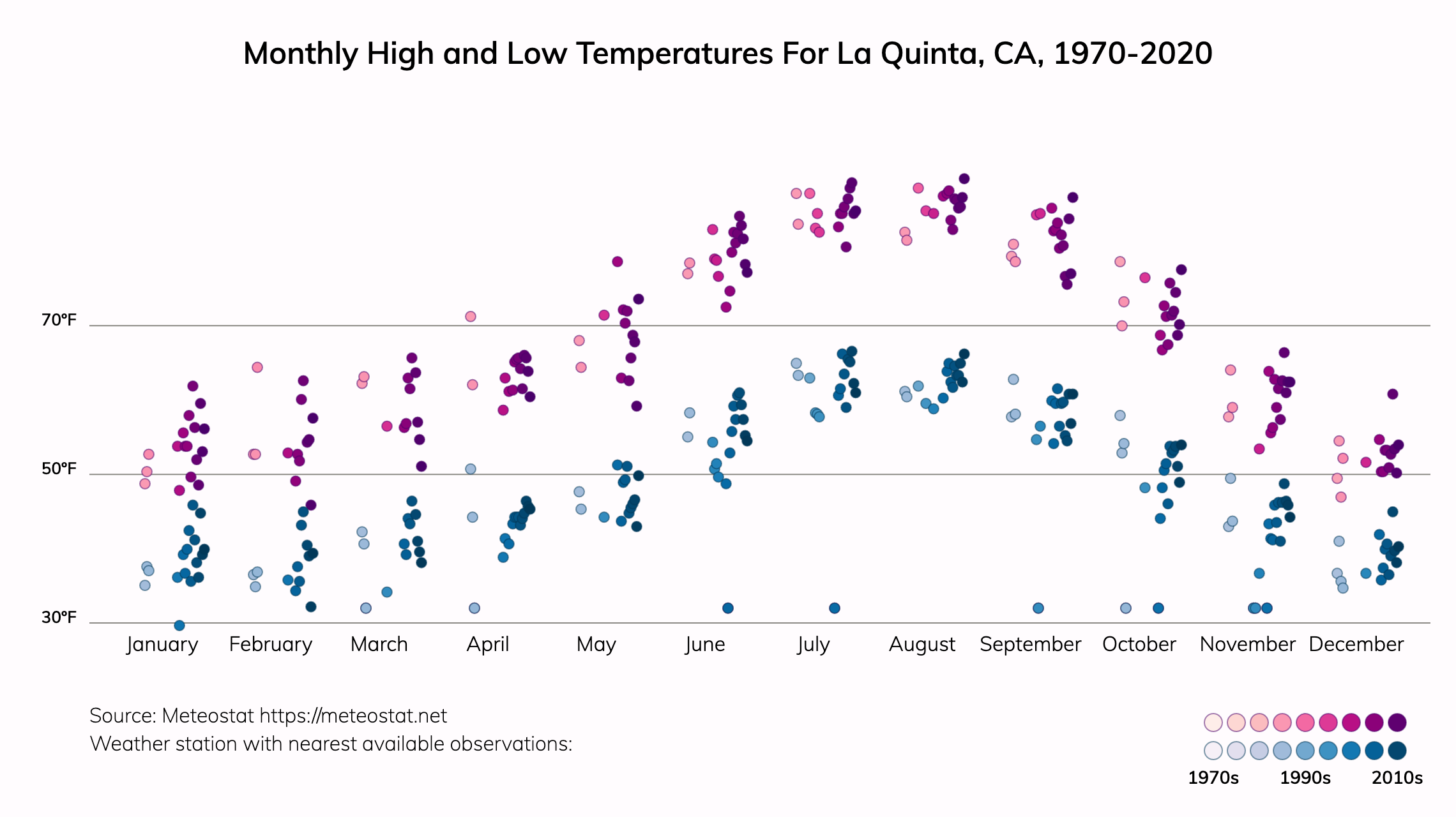 In a typical year around 1990, people in La Quinta, CA experienced about 7 days above 111.4ºF in a year. By 2050, people in La Quinta are projected to experience an average of about 33 days per year over 111.4ºF.Climate change is increasing the frequency and intensity of heat waves, even in places with cooler average temperatures. See more information on heat risk. Everyone can take steps to reduce their risks from extreme heat.