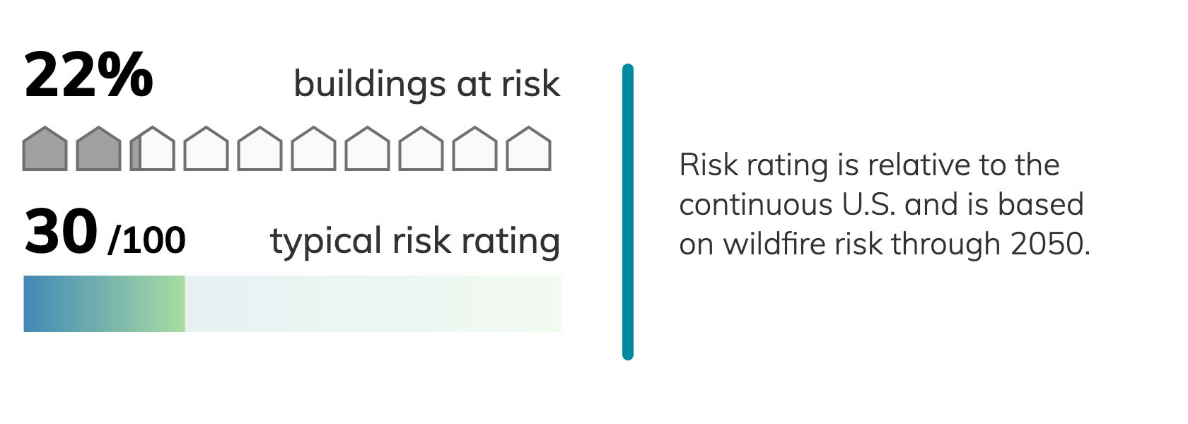 Of 9 census tracts in Newark, CA, there are 6 where more than a quarter of buildings have significant fire risk, and 2 where more than half of buildings have significant fire risk. Property owners can take steps to mitigate their risks from wildfires.Fire risk depends on proximity to vegation: densely developed urban areas have a much lower risk of burning than areas adjacent to wildland. Climate change increases risks from wildfire by creating hotter, drier conditions for fires to spread. ClimateCheck ratings of fire risk are based on projected weather conditions and U.S. Forest Service models simulating fire behavior.