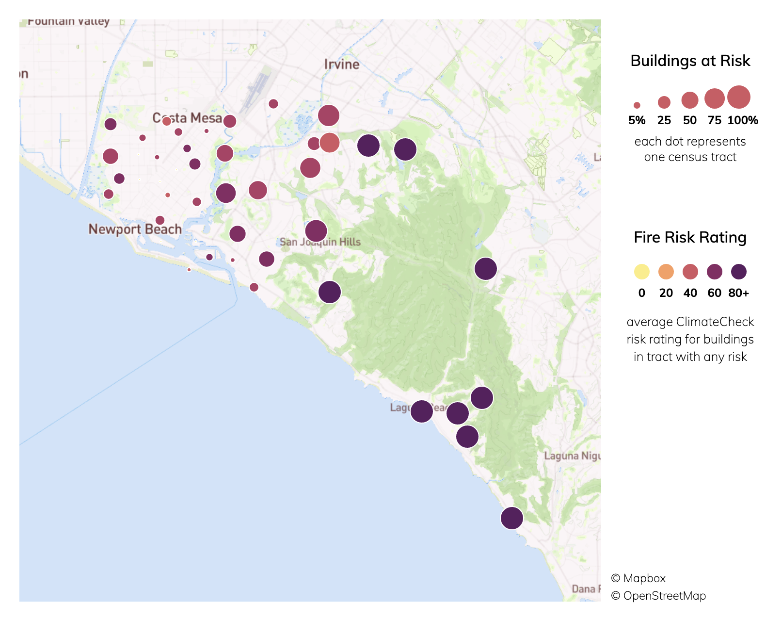 Of 66 census tracts in Newport Beach, CA, there are 32 where more than a quarter of buildings have significant fire risk, and 27 where more than half of buildings have significant fire risk. Property owners can take steps to mitigate their risks from wildfires.Fire risk depends on proximity to vegation: densely developed urban areas have a much lower risk of burning than areas adjacent to wildland. Climate change increases risks from wildfire by creating hotter, drier conditions for fires to spread. ClimateCheck ratings of fire risk are based on projected weather conditions and U.S. Forest Service models simulating fire behavior.