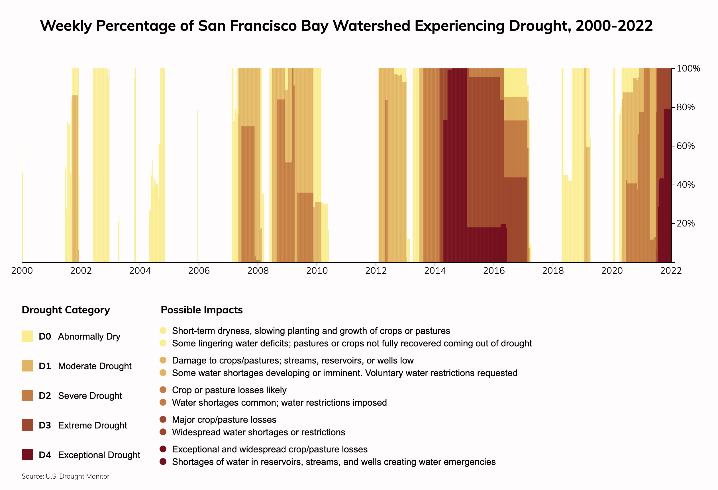The San Francisco Bay watershed, which contains San Francisco, CA, has experienced 723 weeks (60% of weeks) since 2000 with some of its area in drought of any level, and 215 weeks (18% of weeks) since 2000 with some of its area in Extreme or Exceptional drought. Source: National Drought Monitor.Climate change is increasing the risk of drought. Water stress (the ratio of water demand to supply) depends on how water utilities source water and their plans to adapt to climate change. Property owners can also take steps to reduce their risks from drought.