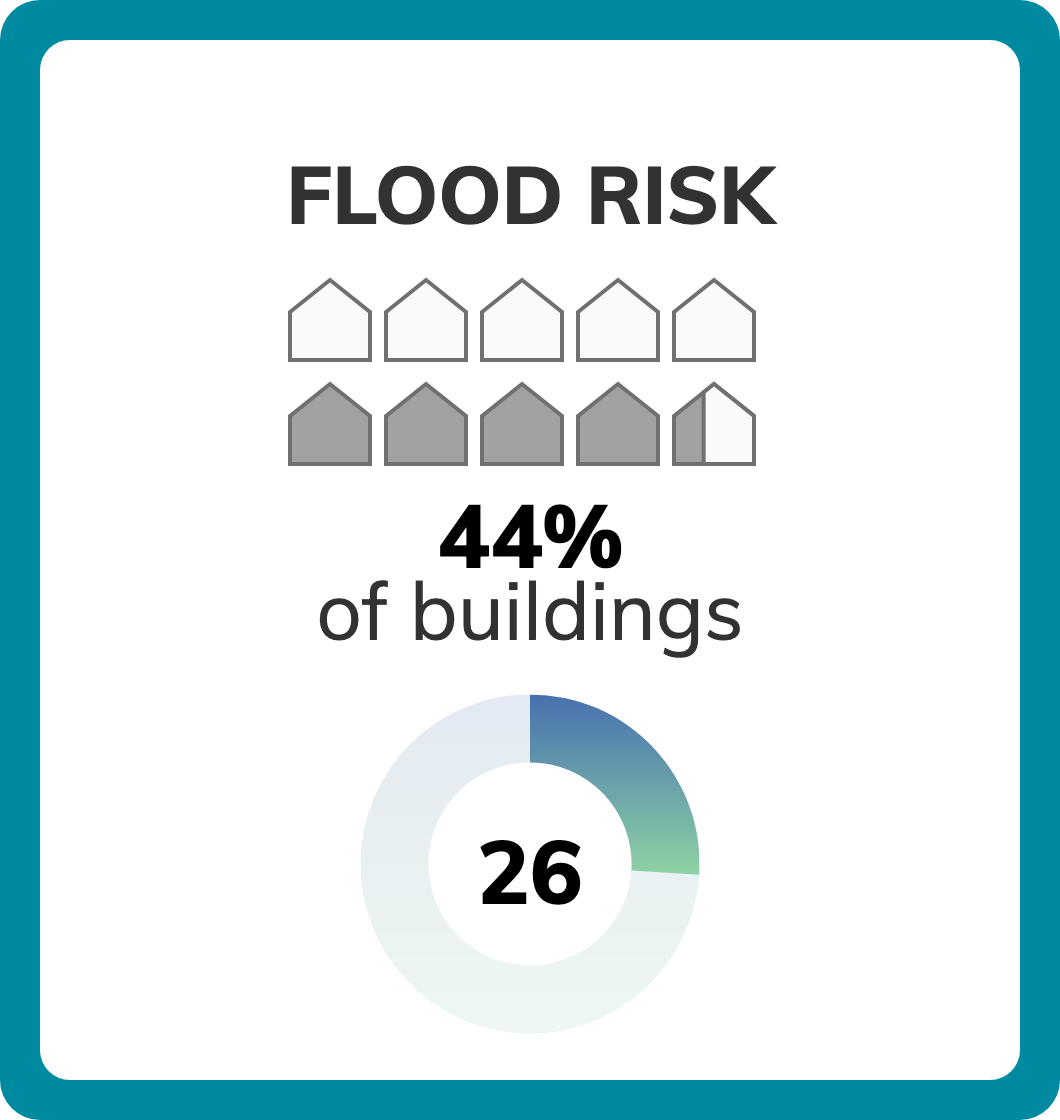 Of 154 census tracts in Santa Ana, CA, there are 77 where more than half of buildings have significant risk from high tide flooding, surface (pluvial) flooding, and riverine (fluvial) flooding. Property owners can check a specific address for flood risk including FEMA flood zone, then take steps to reduce their vulnerability to flooding damage.Climate change is increasing inland and coastal flooding risk due to sea level rise and increasing chances of extreme precipitation. See more information on flooding risk.