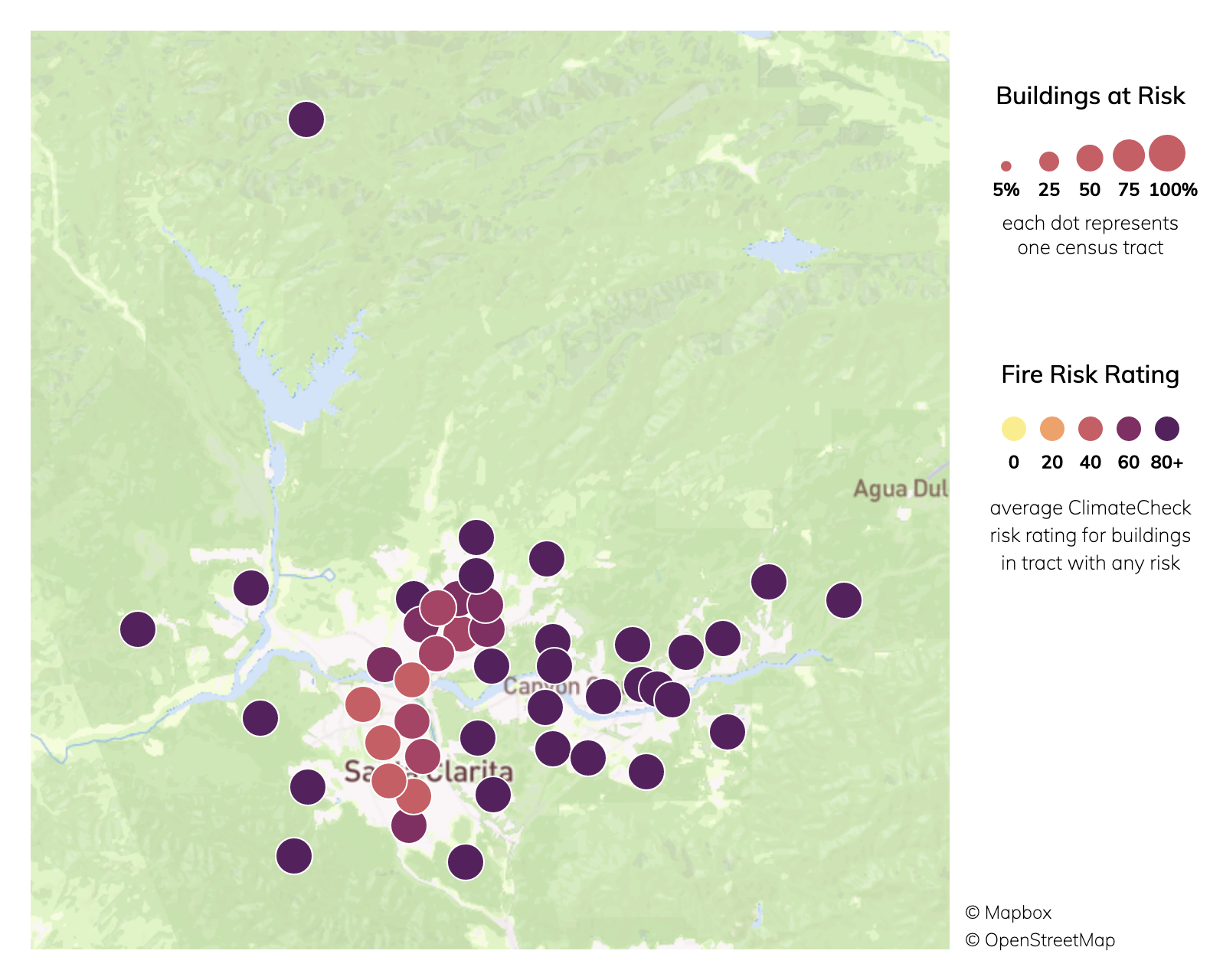 Of 93 census tracts in Santa Clarita, CA, there are 87 where more than a quarter of buildings have significant fire risk, and 87 where more than half of buildings have significant fire risk. Property owners can take steps to mitigate their risks from wildfires.Fire risk depends on proximity to vegation: densely developed urban areas have a much lower risk of burning than areas adjacent to wildland. Climate change increases risks from wildfire by creating hotter, drier conditions for fires to spread. ClimateCheck ratings of fire risk are based on projected weather conditions and U.S. Forest Service models simulating fire behavior.