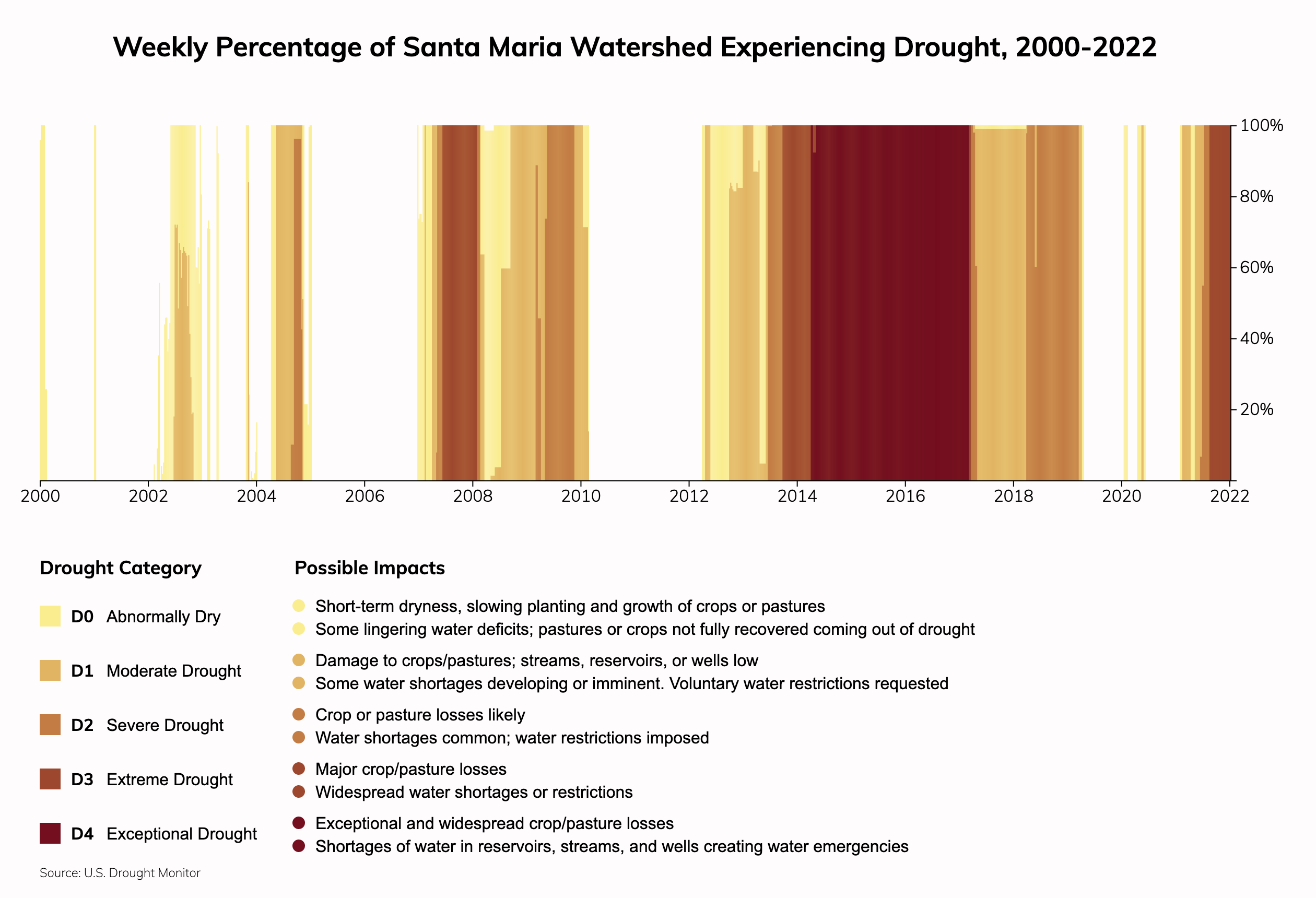 The Santa Maria watershed, which contains Santa Maria, CA, has experienced 760 weeks (63% of weeks) since 2000 with some of its area in drought of any level, and 273 weeks (23% of weeks) since 2000 with some of its area in Extreme or Exceptional drought. Source: National Drought Monitor.Climate change is increasing the risk of drought. Water stress (the ratio of water demand to supply) depends on how water utilities source water and their plans to adapt to climate change. Property owners can also take steps to reduce their risks from drought.