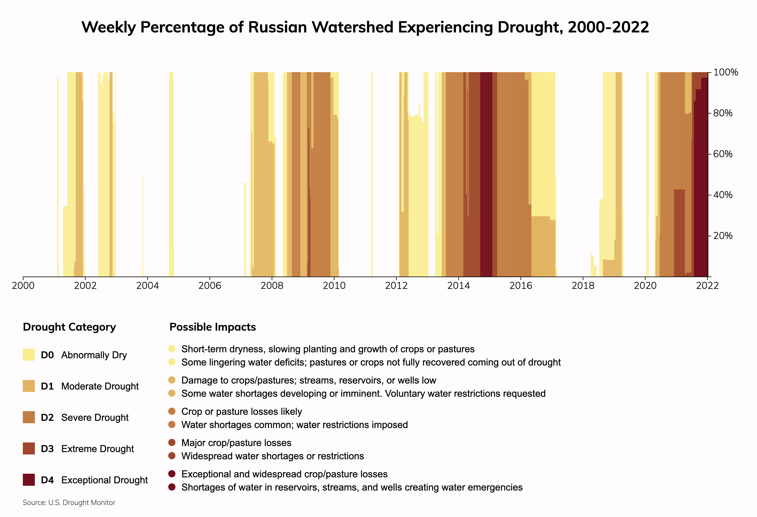 The Russian watershed, which contains Santa Rosa, CA, has experienced 676 weeks (56% of weeks) since 2000 with some of its area in drought of any level, and 194 weeks (16% of weeks) since 2000 with some of its area in Extreme or Exceptional drought. Source: National Drought Monitor.Climate change is increasing the risk of drought. Water stress (the ratio of water demand to supply) depends on how water utilities source water and their plans to adapt to climate change. Property owners can also take steps to reduce their risks from drought.