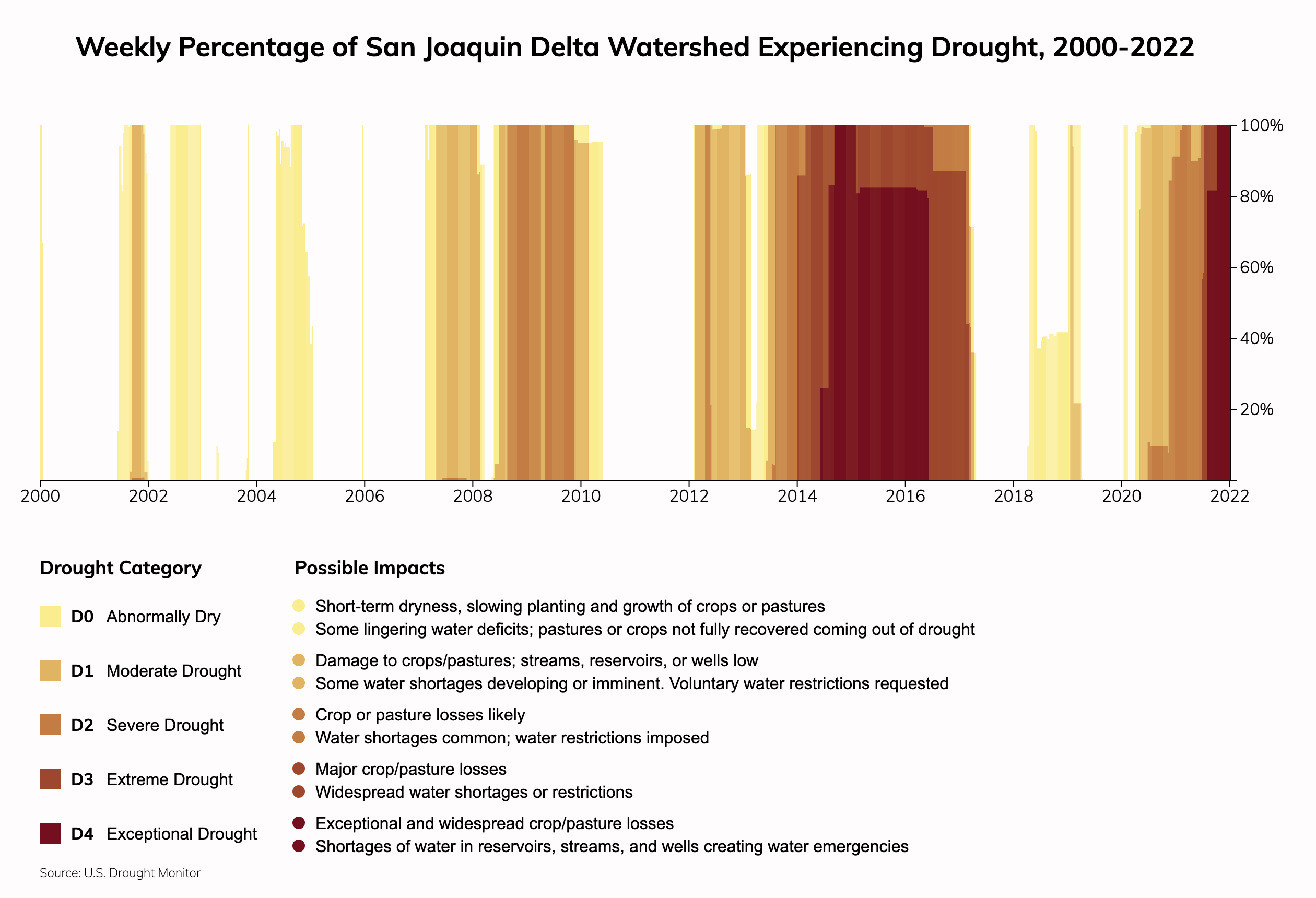 The Lower Delaware watershed, which contains Stockton, CA, has experienced 351 weeks (29% of weeks) since 2000 with some of its area in drought of any level, and 18 weeks (2% of weeks) since 2000 with some of its area in Extreme or Exceptional drought. Source: National Drought Monitor.Climate change is increasing the risk of drought. Water stress (the ratio of water demand to supply) depends on how water utilities source water and their plans to adapt to climate change. Property owners can also take steps to reduce their risks from drought.