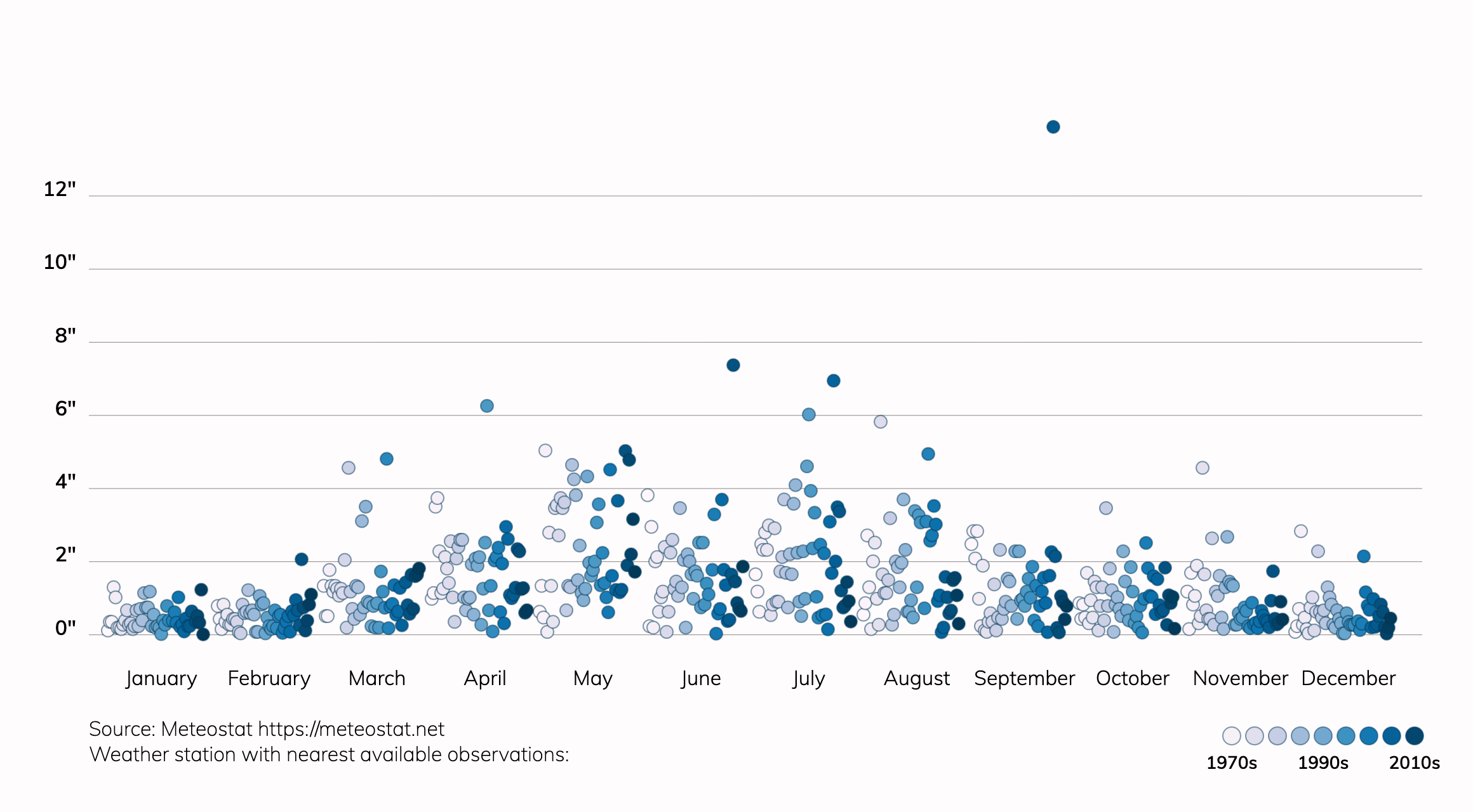 A downpour for Denver, CO is a two-day rainfall total over 0.4 inches. Around 1990, about 46.0% of precipitation fell during these downpours. In 2050, this is projected to be about 50.0%. The annual precipitation in Denver, CO is projected to increase from about 15.3" to about 16.1".Extreme precipitation in any form can pose significant risks. Climate change is increasing the potential for extreme rainfall or snowfall because warmer air can hold more water vapor. See more information on storm risk. Property owners can take steps to reduce their risks from extreme precipitation.