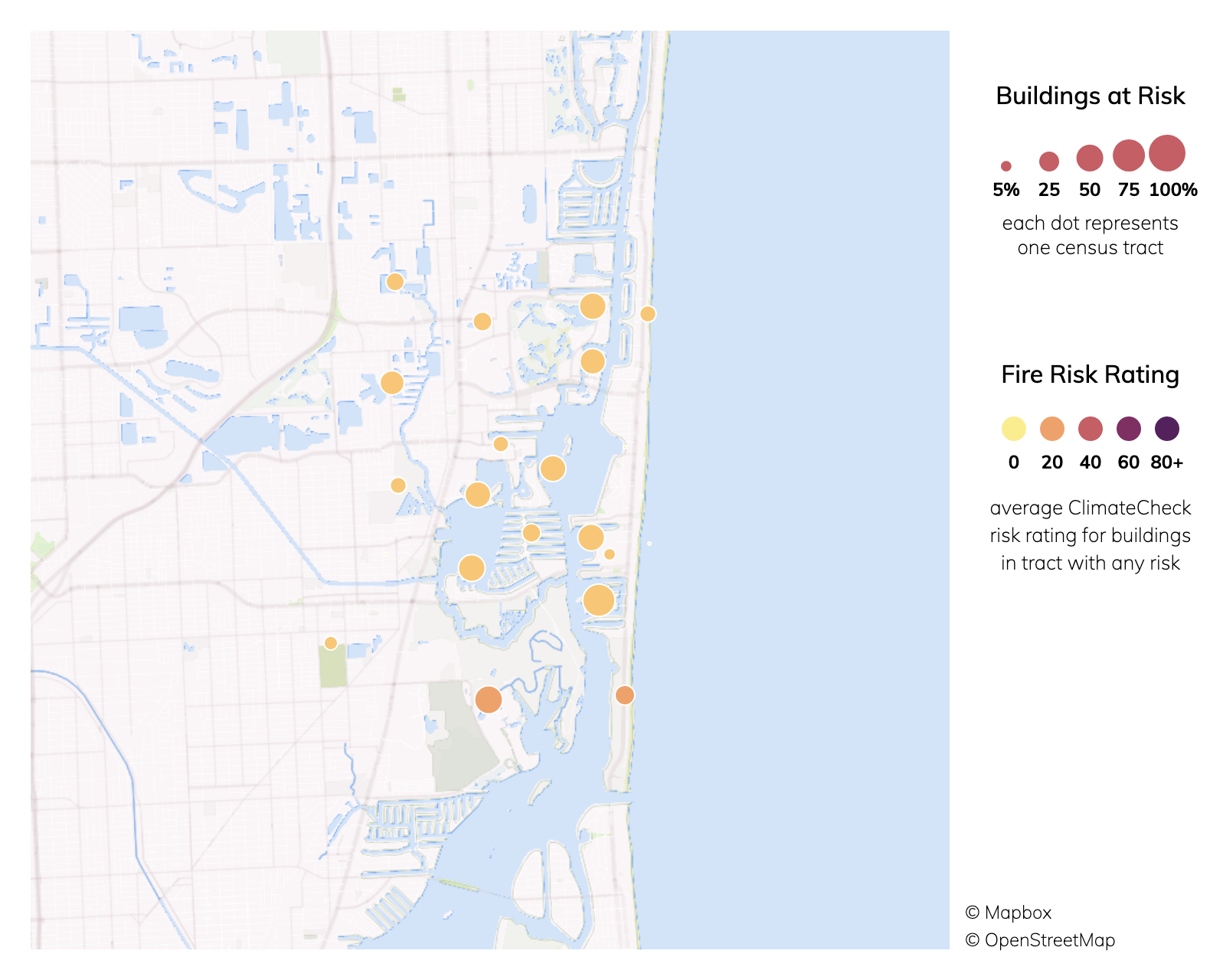 Of 29 census tracts in Aventura, FL, there are 22 where more than a quarter of buildings have significant fire risk, and 15 where more than half of buildings have significant fire risk. Property owners can take steps to mitigate their risks from wildfires.Fire risk depends on proximity to vegation: densely developed urban areas have a much lower risk of burning than areas adjacent to wildland. Climate change increases risks from wildfire by creating hotter, drier conditions for fires to spread. ClimateCheck ratings of fire risk are based on projected weather conditions and U.S. Forest Service models simulating fire behavior.