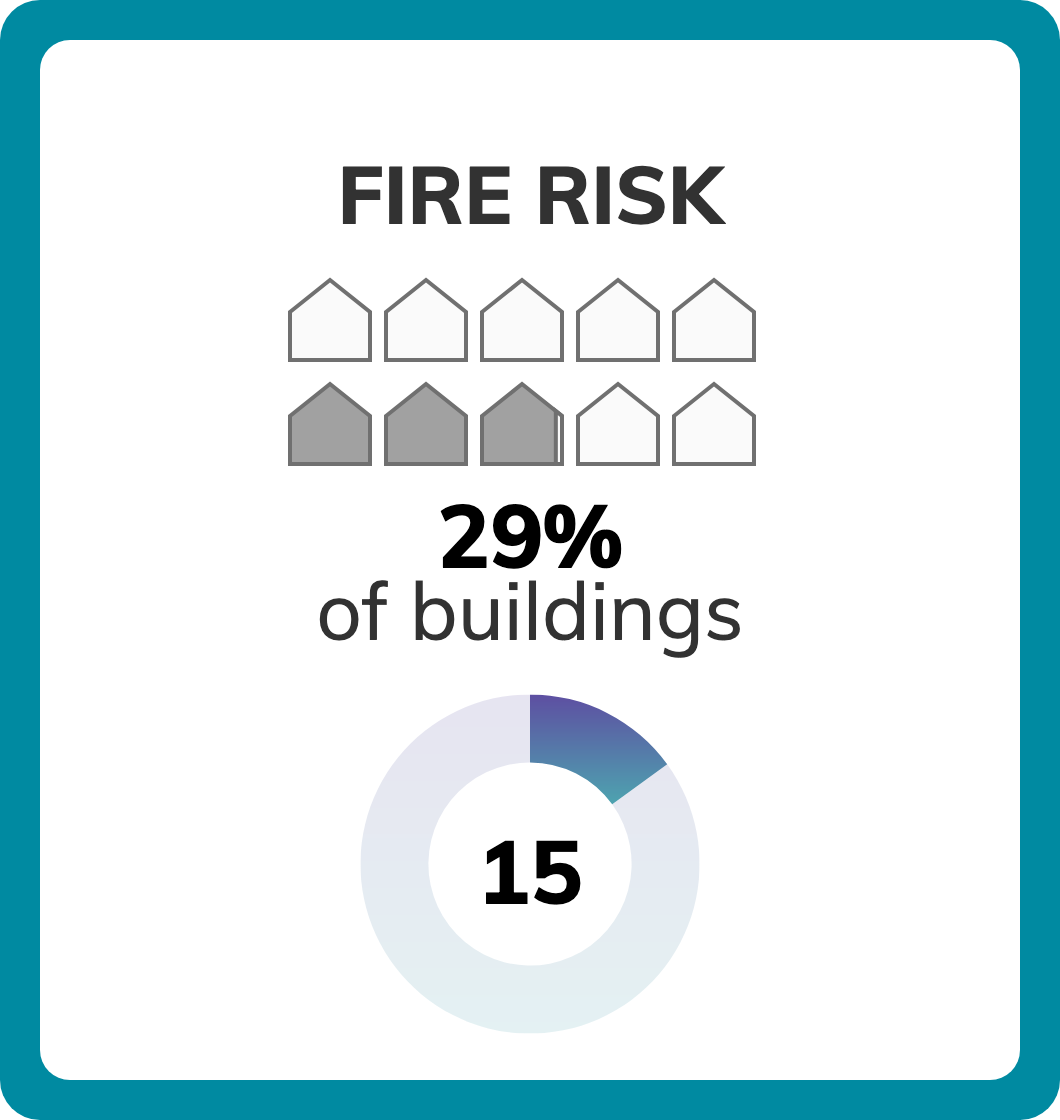 Of 60 census tracts in Dunedin, FL, there are 53 where more than a quarter of buildings have significant fire risk, and 39 where more than half of buildings have significant fire risk. Property owners can take steps to mitigate their risks from wildfires.Fire risk depends on proximity to vegation: densely developed urban areas have a much lower risk of burning than areas adjacent to wildland. Climate change increases risks from wildfire by creating hotter, drier conditions for fires to spread. ClimateCheck ratings of fire risk are based on projected weather conditions and U.S. Forest Service models simulating fire behavior.