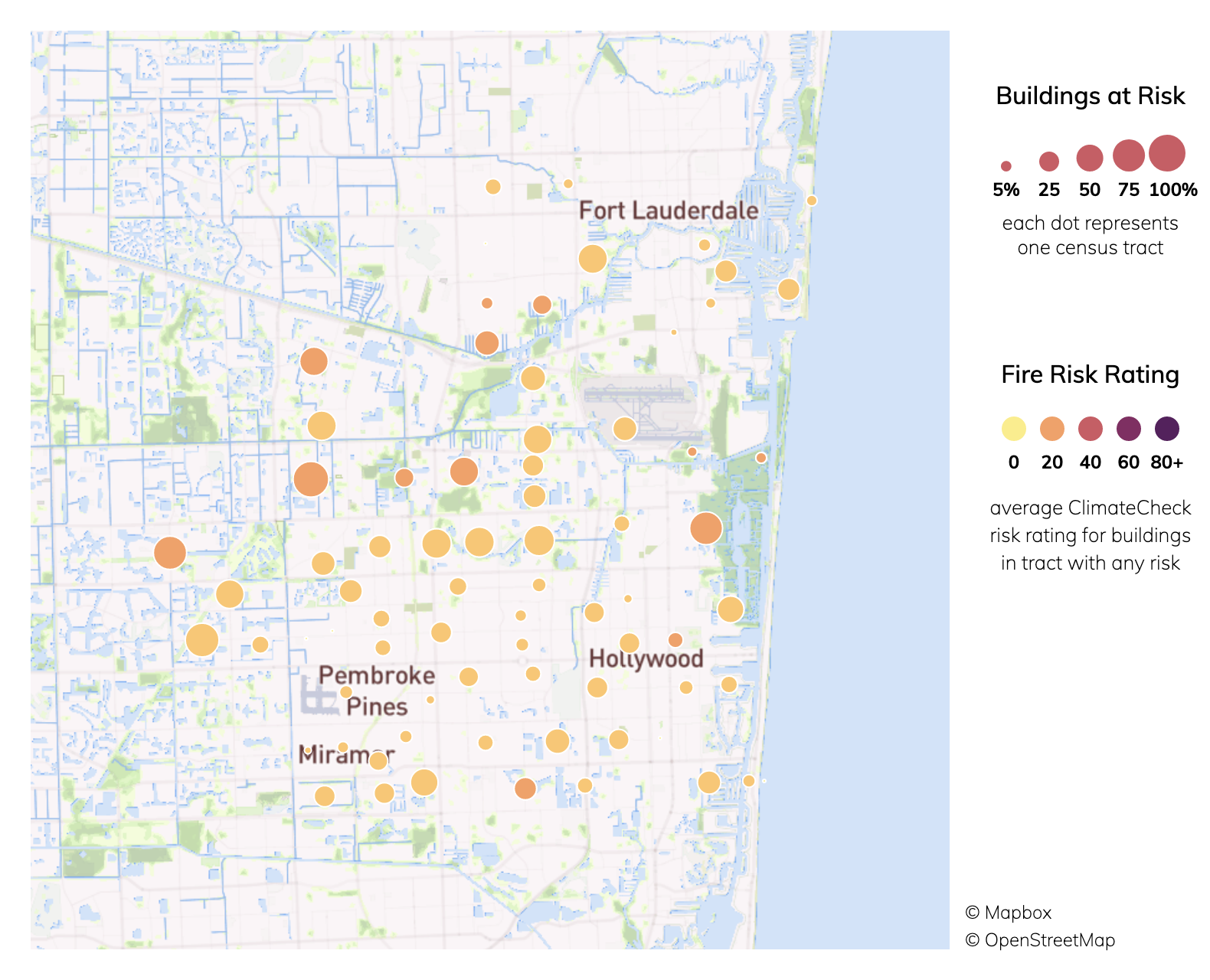 Of 129 census tracts in Hollywood, FL, there are 68 where more than a quarter of buildings have significant fire risk, and 44 where more than half of buildings have significant fire risk. Property owners can take steps to mitigate their risks from wildfires.Fire risk depends on proximity to vegation: densely developed urban areas have a much lower risk of burning than areas adjacent to wildland. Climate change increases risks from wildfire by creating hotter, drier conditions for fires to spread. ClimateCheck ratings of fire risk are based on projected weather conditions and U.S. Forest Service models simulating fire behavior.