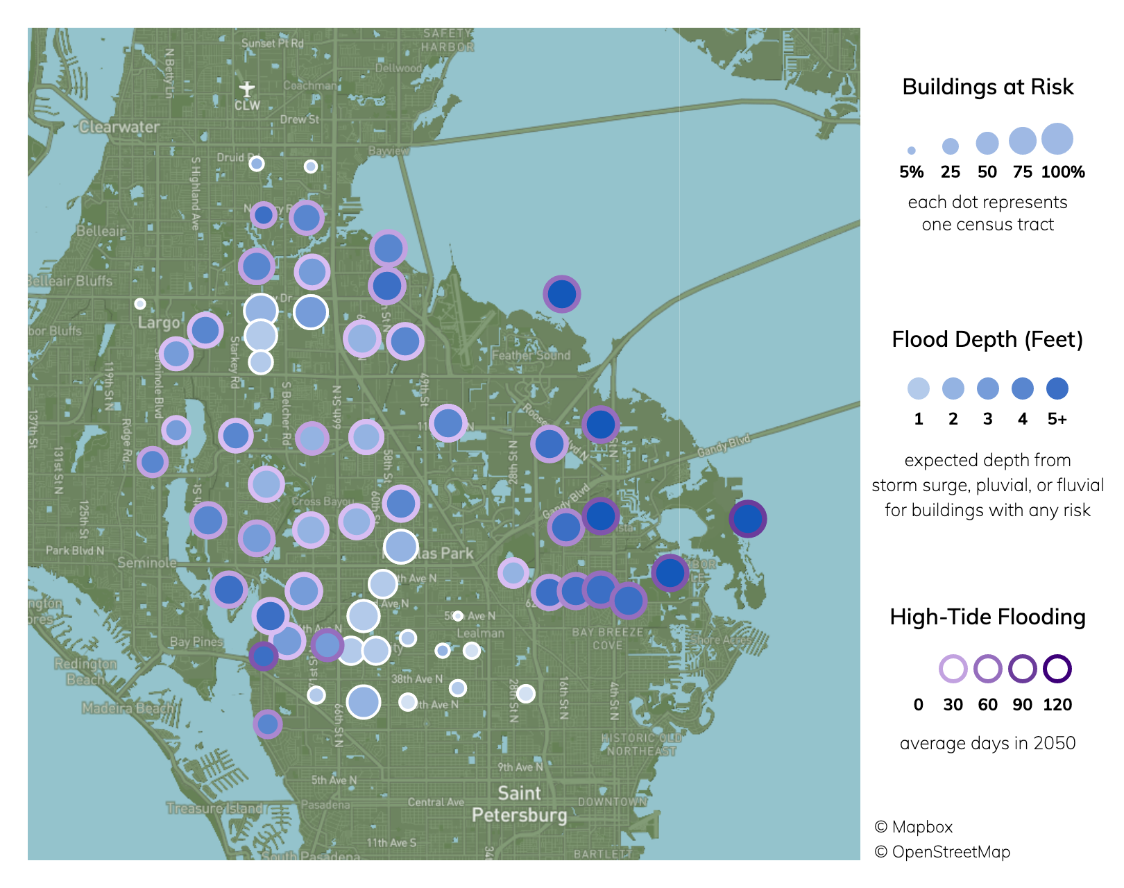 Of 117 census tracts in Pinellas Park, FL, there are 96 where more than half of buildings have significant risk from storm surge, high tide flooding, surface (pluvial) flooding, and riverine (fluvial) flooding. Property owners can check a specific address for flood risk including FEMA flood zone, then take steps to reduce their vulnerability to flooding damage.Climate change is increasing inland and coastal flooding risk due to sea level rise and increasing chances of extreme precipitation. See more information on flooding risk.