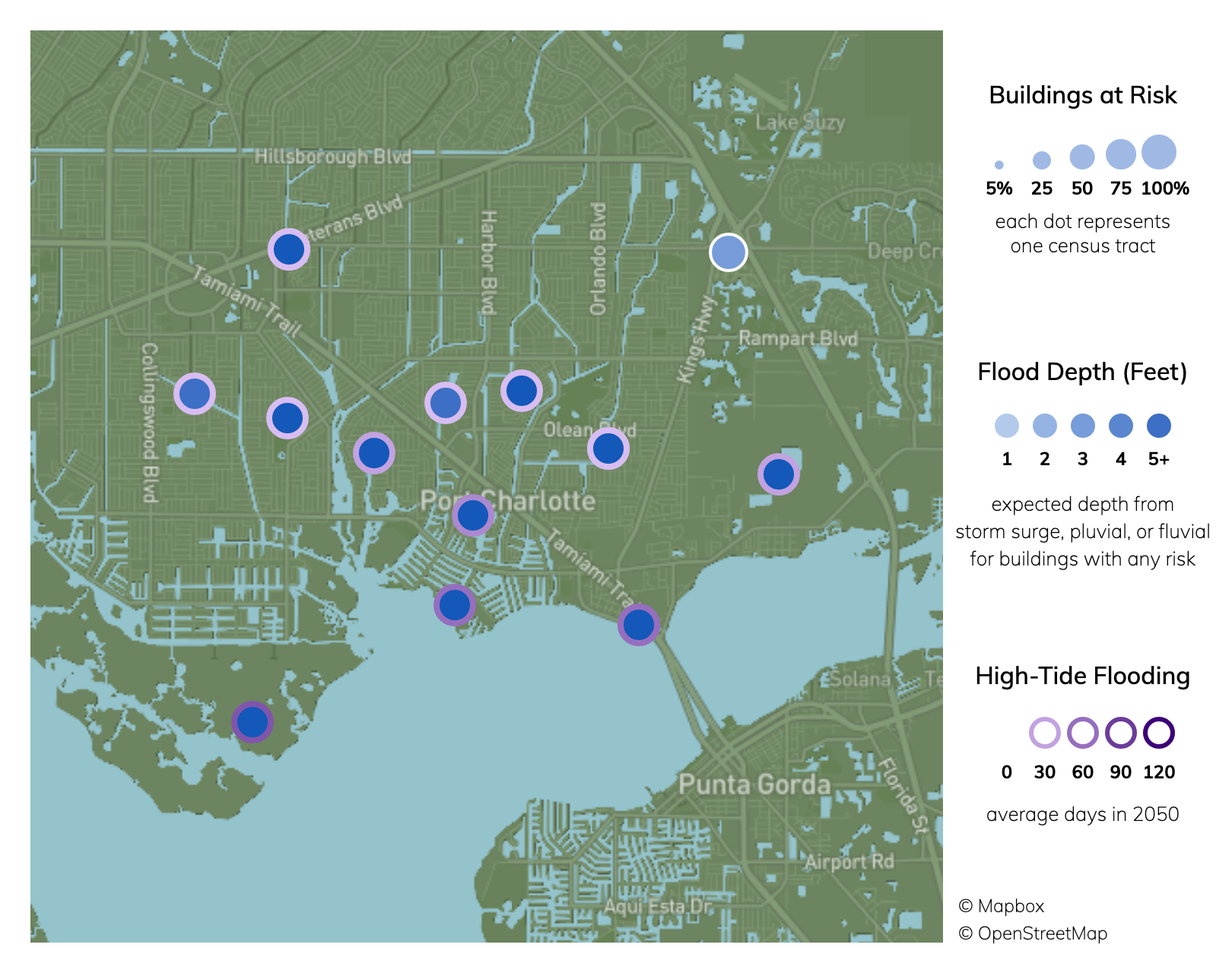 Of 21 census tracts in Port Charlotte, FL, there are 21 where more than half of buildings have significant risk from storm surge, high tide flooding, surface (pluvial) flooding, and riverine (fluvial) flooding. Property owners can check a specific address for flood risk including FEMA flood zone, then take steps to reduce their vulnerability to flooding damage.Climate change is increasing inland and coastal flooding risk due to sea level rise and increasing chances of extreme precipitation. See more information on flooding risk.
