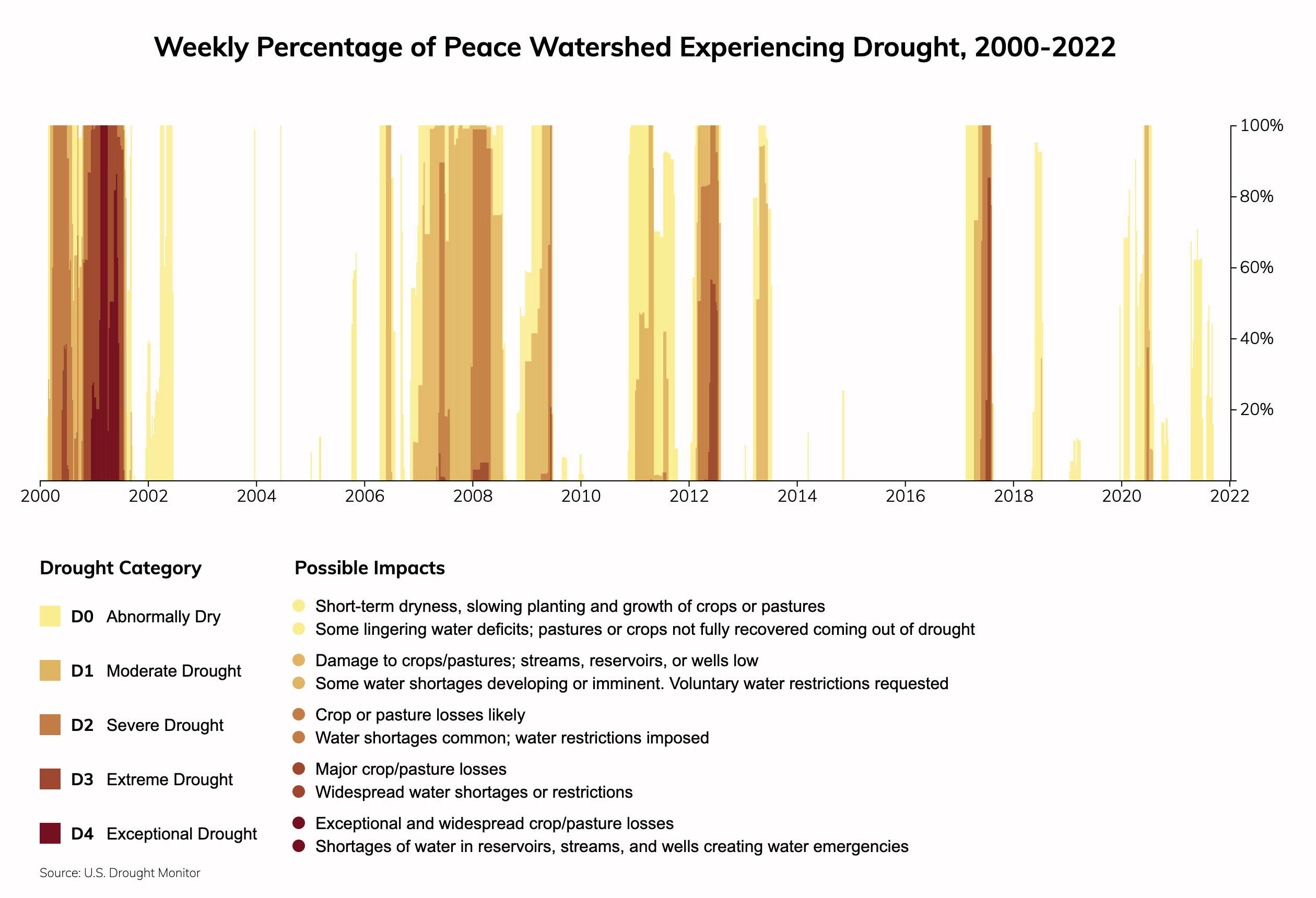 The Peace watershed, which contains Port Charlotte, FL, has experienced 500 weeks (42% of weeks) since 2000 with some of its area in drought of any level, and 87 weeks (7% of weeks) since 2000 with some of its area in Extreme or Exceptional drought. Source: National Drought Monitor.Climate change is increasing the risk of drought. Water stress (the ratio of water demand to supply) depends on how water utilities source water and their plans to adapt to climate change. Property owners can also take steps to reduce their risks from drought.