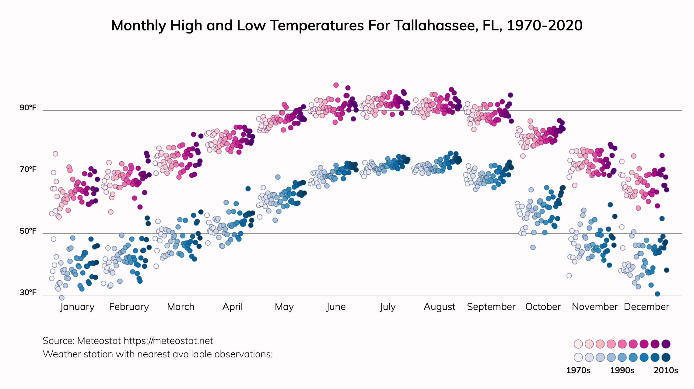 In a typical year around 1990, people in Tallahassee, FL experienced about 7 days above 96.1ºF in a year. By 2050, people in Tallahassee are projected to experience an average of about 57 days per year over 96.1ºF.Climate change is increasing the frequency and intensity of heat waves, even in places with cooler average temperatures. See more information on heat risk. Everyone can take steps to reduce their risks from extreme heat.