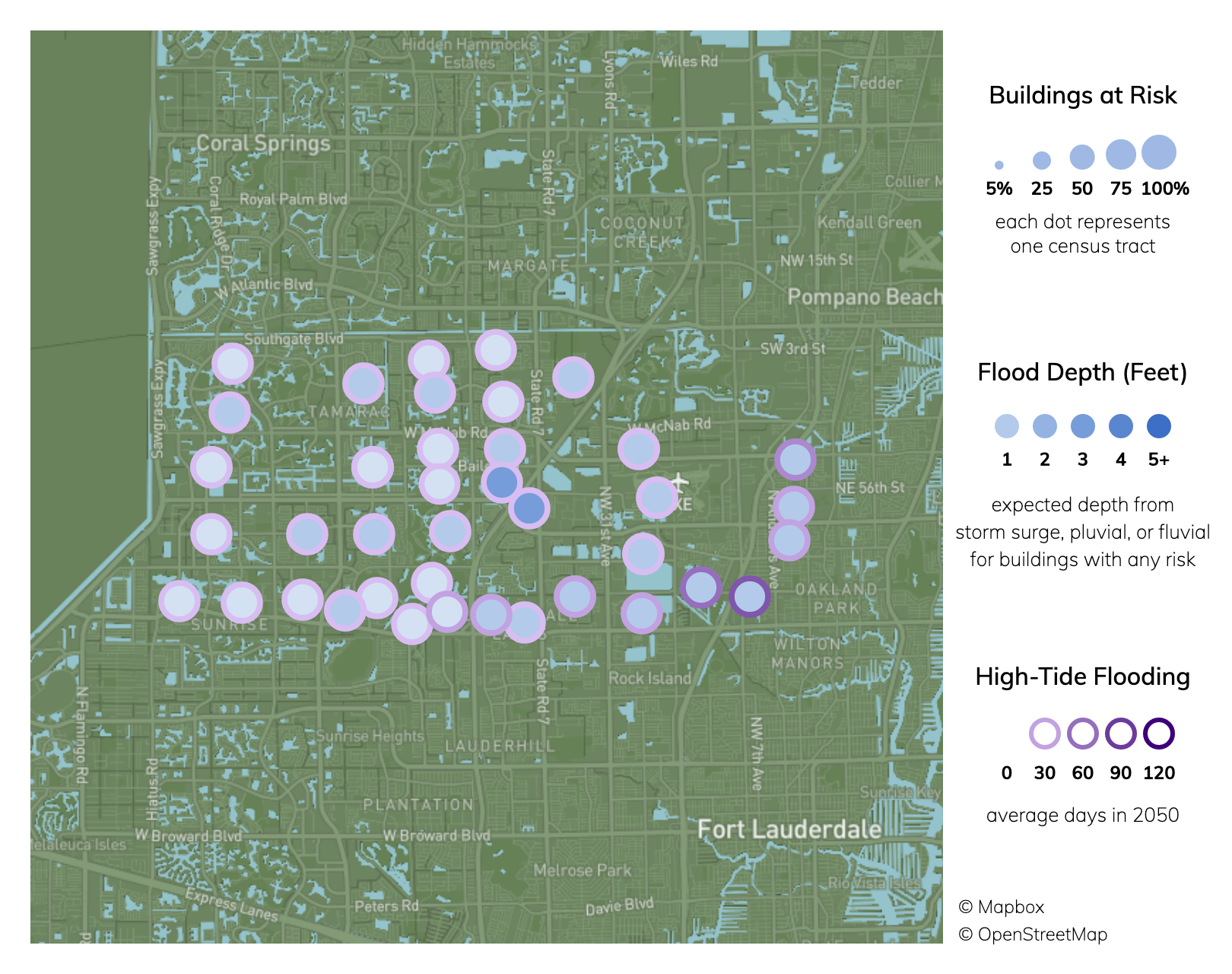 Of 57 census tracts in Tamarac, FL, there are 57 where more than half of buildings have significant risk from storm surge, high tide flooding, surface (pluvial) flooding, and riverine (fluvial) flooding. Property owners can check a specific address for flood risk including FEMA flood zone, then take steps to reduce their vulnerability to flooding damage.Climate change is increasing inland and coastal flooding risk due to sea level rise and increasing chances of extreme precipitation. See more information on flooding risk.