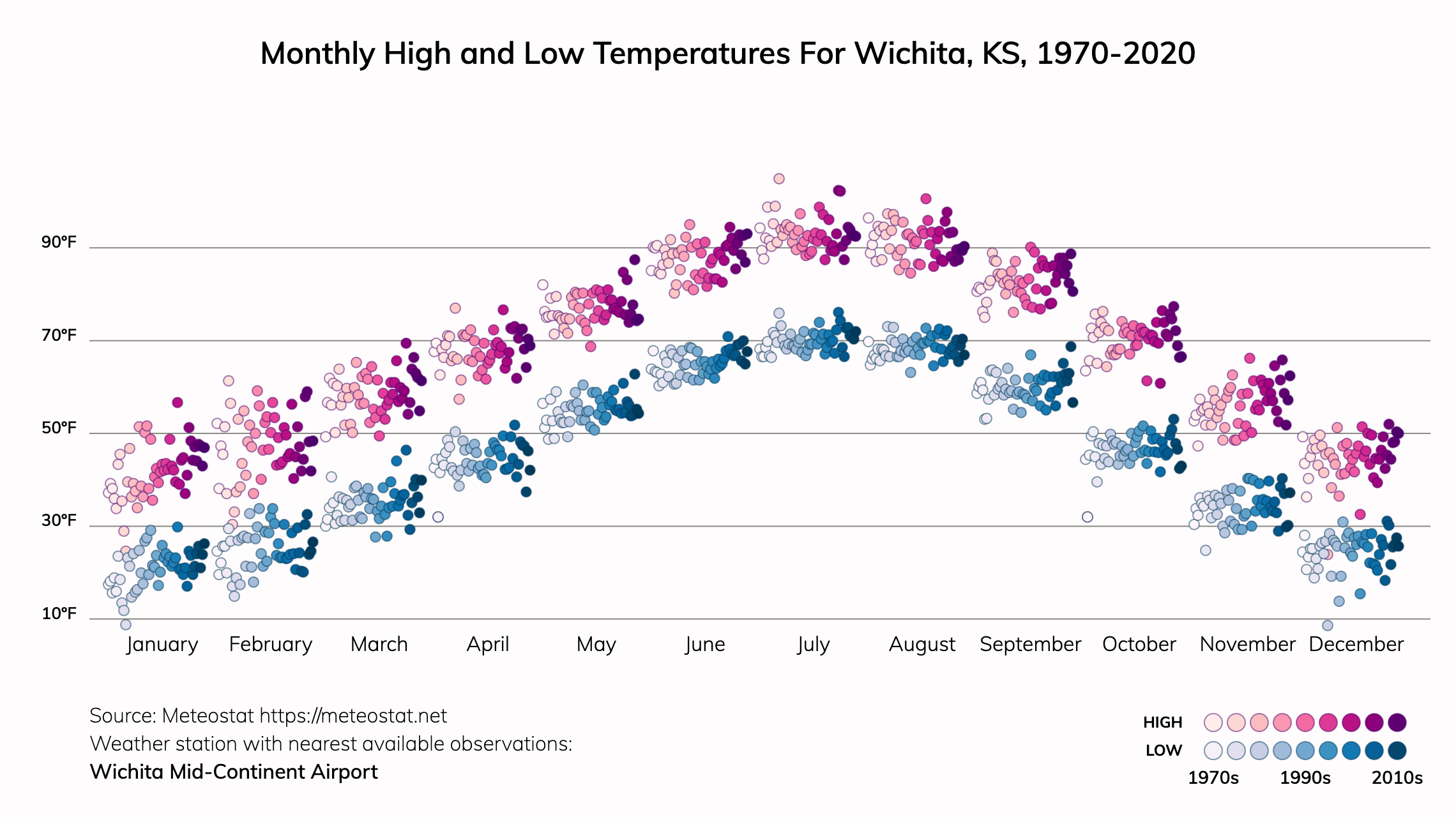 In a typical year around 1990, people in Wichita, KS experienced about 7 days above 101.7ºF in a year. By 2050, people in Wichita are projected to experience an average of about 31 days per year over 101.7ºF.Climate change is increasing the frequency and intensity of heat waves, even in places with cooler average temperatures. See more information on heat risk. Everyone can take steps to reduce their risks from extreme heat.