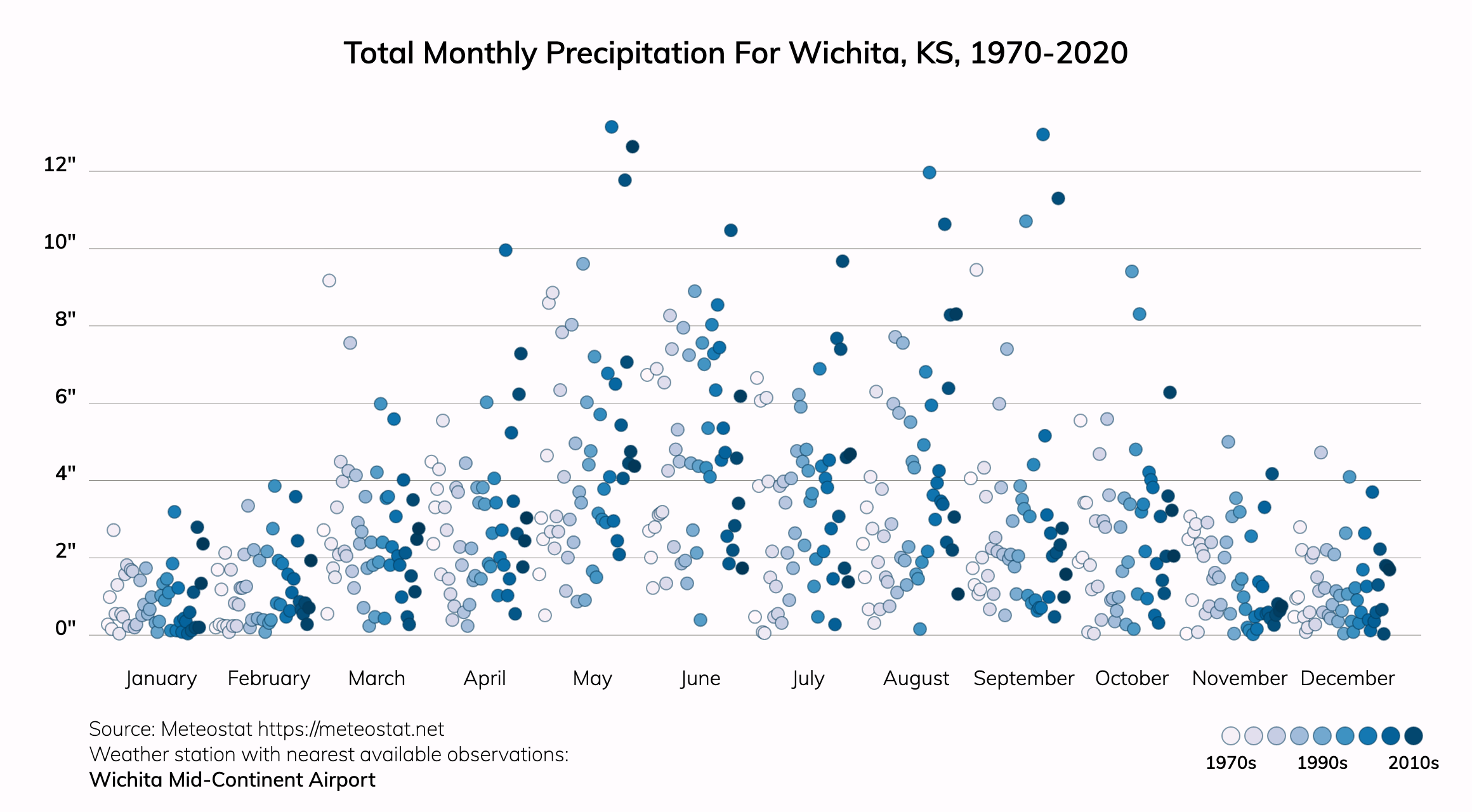 A downpour for Wichita, KS is a two-day rainfall total over 0.9 inches. Around 1990, about 47.0% of precipitation fell during these downpours. In 2050, this is projected to be about 51.0%. The annual precipitation in Wichita, KS is projected to increase from about 31.7" to about 33.0".Extreme precipitation in any form can pose significant risks. Climate change is increasing the potential for extreme rainfall or snowfall because warmer air can hold more water vapor. See more information on storm risk. Property owners can take steps to reduce their risks from extreme precipitation.