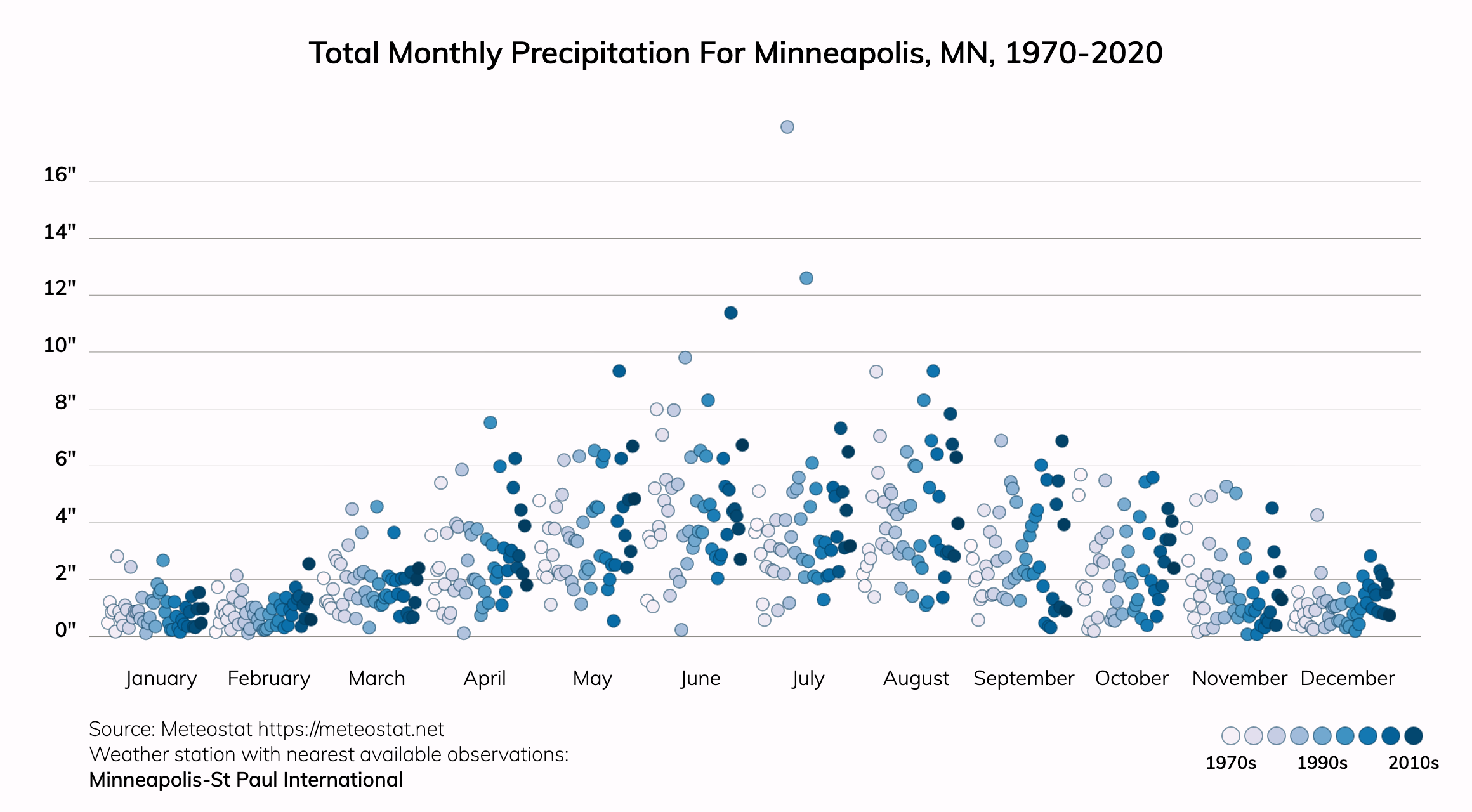 A downpour for Minneapolis, MN is a two-day rainfall total over 0.7 inches. Around 1990, about 44.0% of precipitation fell during these downpours. In 2050, this is projected to be about 47.0%. The annual precipitation in Minneapolis, MN is projected to increase from about 29.8" to about 31.9".Extreme precipitation in any form can pose significant risks. Climate change is increasing the potential for extreme rainfall or snowfall because warmer air can hold more water vapor. See more information on storm risk. Property owners can take steps to reduce their risks from extreme precipitation.