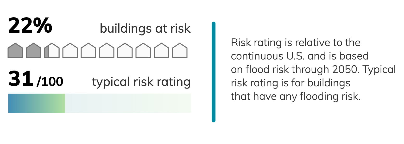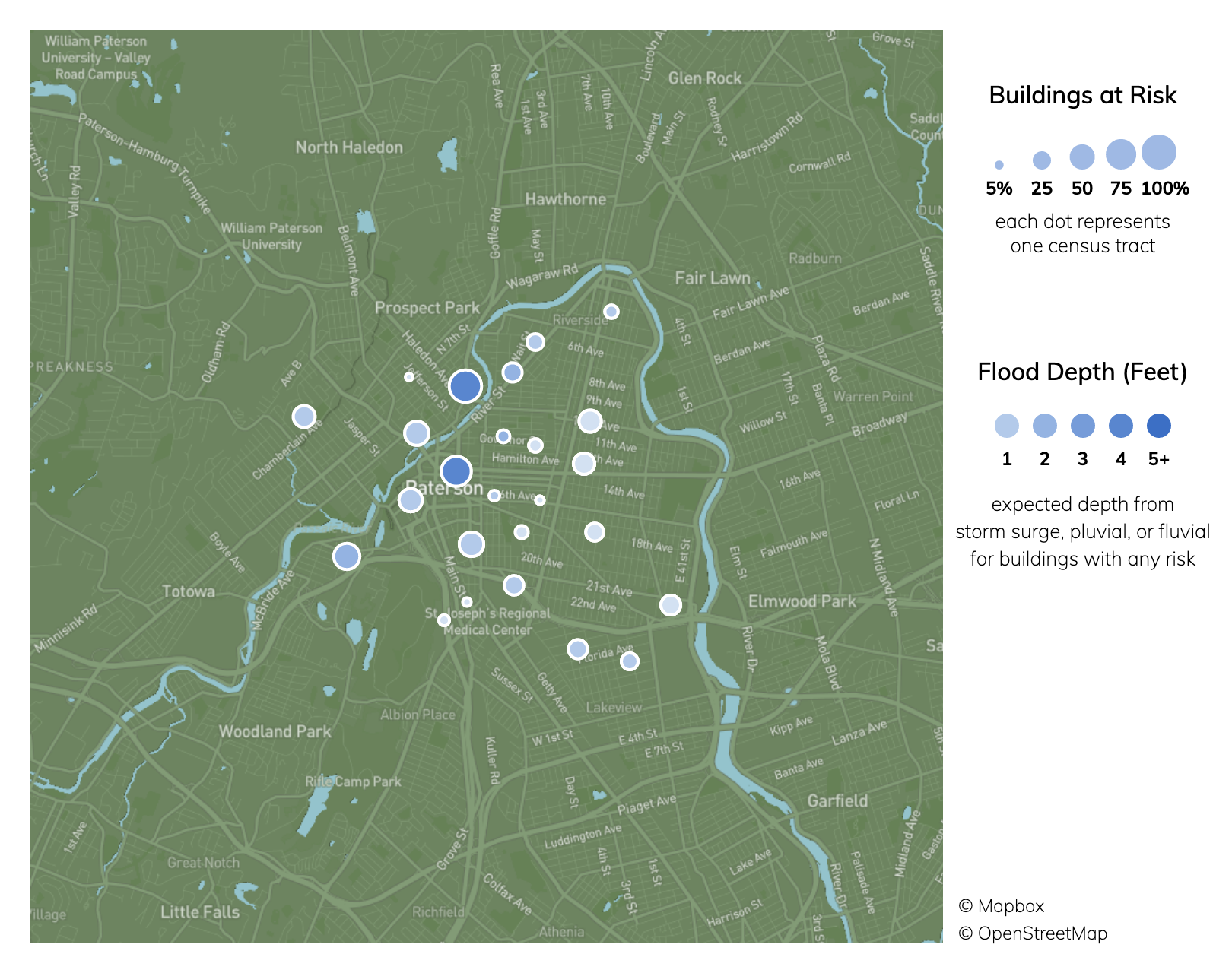 Of 70 census tracts in Paterson, NJ, there are 5 where more than half of buildings have significant risk from surface (pluvial) flooding and riverine (fluvial) flooding. Property owners can check a specific address for flood risk including FEMA flood zone, then take steps to reduce their vulnerability to flooding damage.Climate change is increasing inland and coastal flooding risk due to sea level rise and increasing chances of extreme precipitation. See more information on flooding risk.