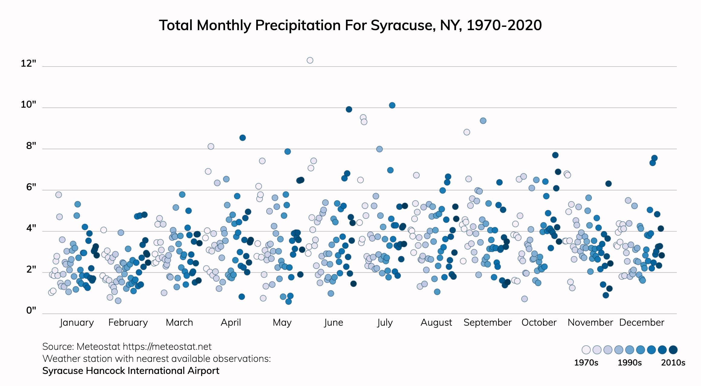A downpour for Syracuse, NY is a two-day rainfall total over 0.8 inches. Around 1990, about 35.0% of precipitation fell during these downpours. In 2050, this is projected to be about 42.0%. The annual precipitation in Syracuse, NY is projected to increase from about 39.7" to about 42.7".Extreme precipitation in any form can pose significant risks. Climate change is increasing the potential for extreme rainfall or snowfall because warmer air can hold more water vapor. See more information on storm risk. Property owners can take steps to reduce their risks from extreme precipitation.