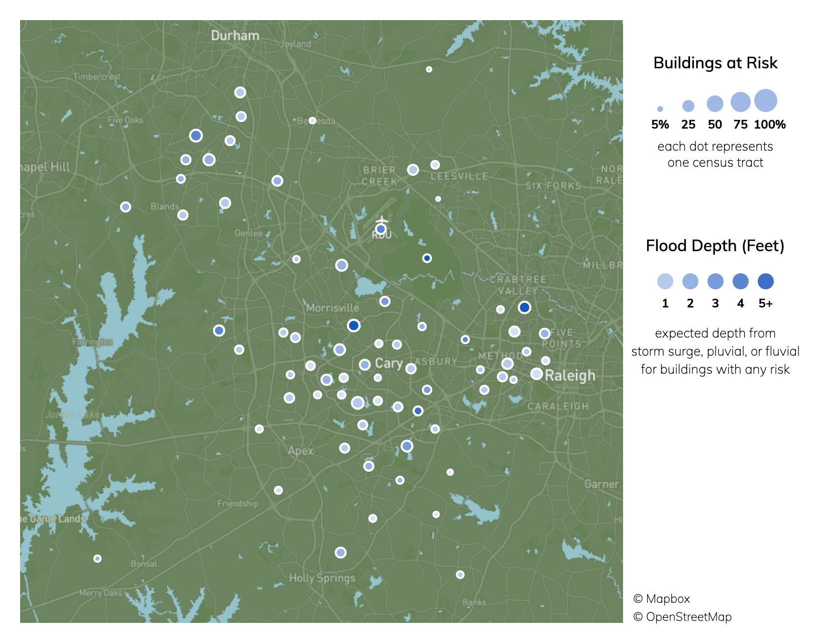 Of 156 census tracts in Cary, NC, there are none where more than a quarter of buildings have significant flood risk. Property owners can check a specific address for flood risk including FEMA flood zone, then take steps to reduce their vulnerability to flooding damage.Climate change is increasing inland and coastal flooding risk due to sea level rise and increasing chances of extreme precipitation. See more information on flooding risk.