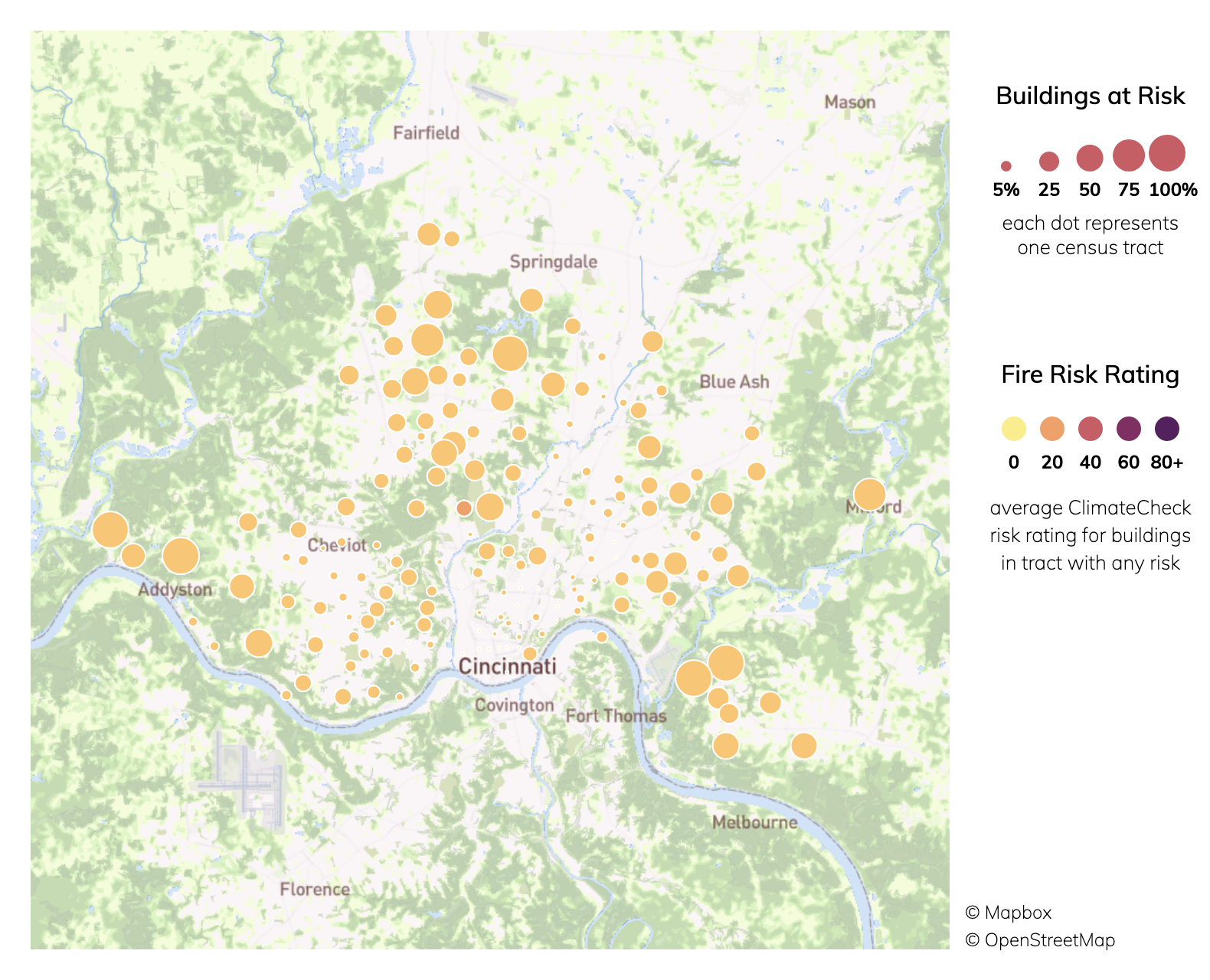 Of 315 census tracts in Cincinnati, OH, there are 247 where more than a quarter of buildings have significant fire risk, and 239 where more than half of buildings have significant fire risk. Property owners can take steps to mitigate their risks from wildfires.Fire risk depends on proximity to vegation: densely developed urban areas have a much lower risk of burning than areas adjacent to wildland. Climate change increases risks from wildfire by creating hotter, drier conditions for fires to spread. ClimateCheck ratings of fire risk are based on projected weather conditions and U.S. Forest Service models simulating fire behavior.