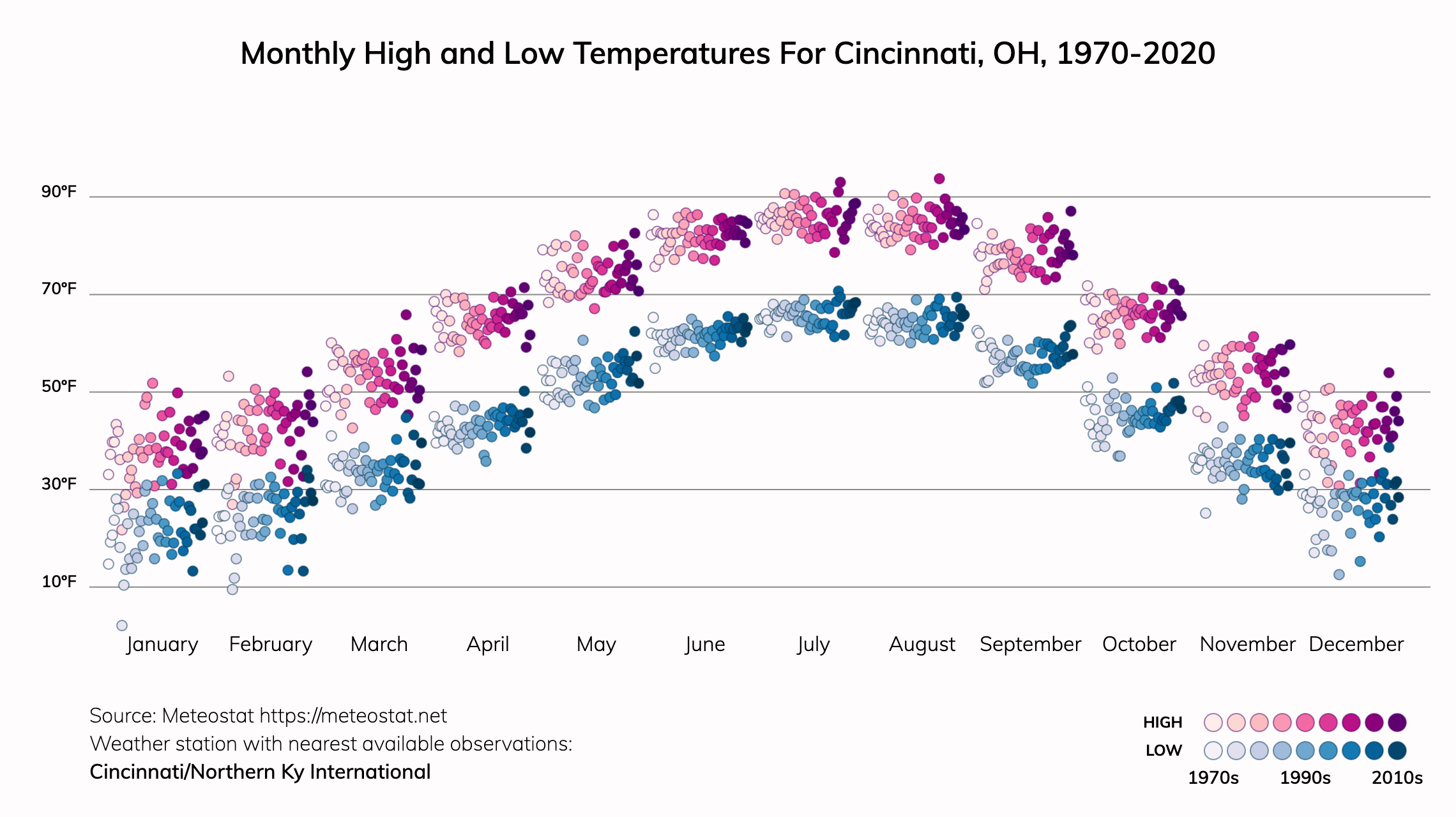 In a typical year around 1990, people in Cincinnati, OH experienced about 7 days above 93.4ºF in a year. By 2050, people in Cincinnati are projected to experience an average of about 43 days per year over 93.4ºF.Climate change is increasing the frequency and intensity of heat waves, even in places with cooler average temperatures. See more information on heat risk. Everyone can take steps to reduce their risks from extreme heat.