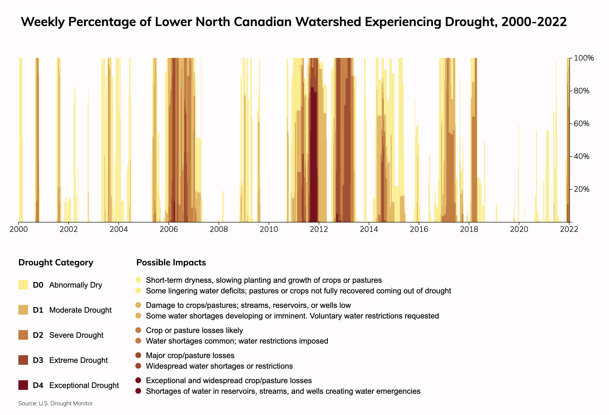 The Lower North Canadian watershed, which contains Oklahoma City, OK, has experienced 692 weeks (58% of weeks) since 2000 with some of its area in drought of any level, and 116 weeks (10% of weeks) since 2000 with some of its area in Extreme or Exceptional drought. Source: National Drought Monitor.Climate change is increasing the risk of drought. Water stress (the ratio of water demand to supply) depends on how water utilities source water and their plans to adapt to climate change. Property owners can also take steps to reduce their risks from drought.