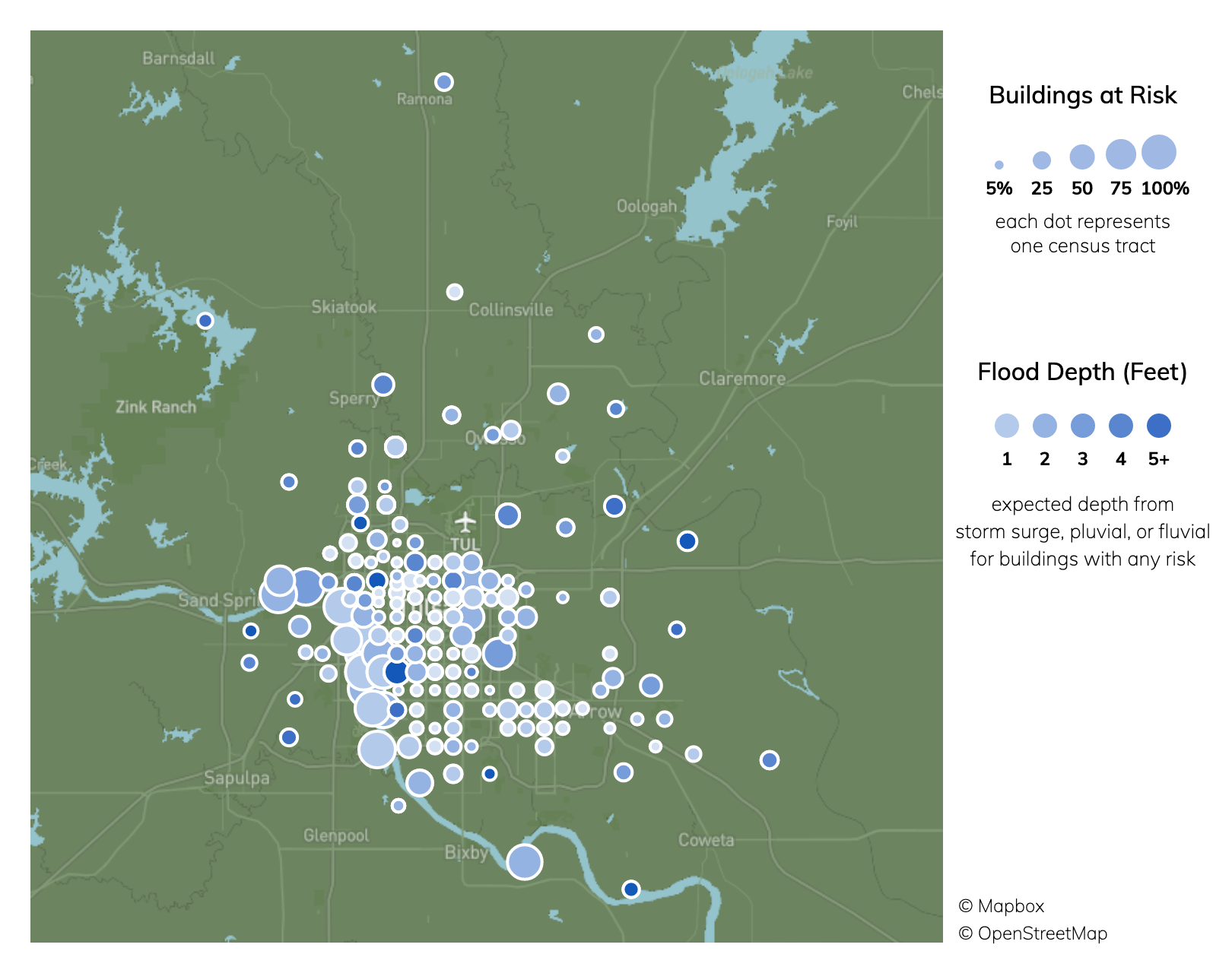 Of 330 census tracts in Tulsa, OK, there are 31 where more than half of buildings have significant risk from surface (pluvial) flooding and riverine (fluvial) flooding. Property owners can check a specific address for flood risk including FEMA flood zone, then take steps to reduce their vulnerability to flooding damage.Climate change is increasing inland and coastal flooding risk due to sea level rise and increasing chances of extreme precipitation. See more information on flooding risk.