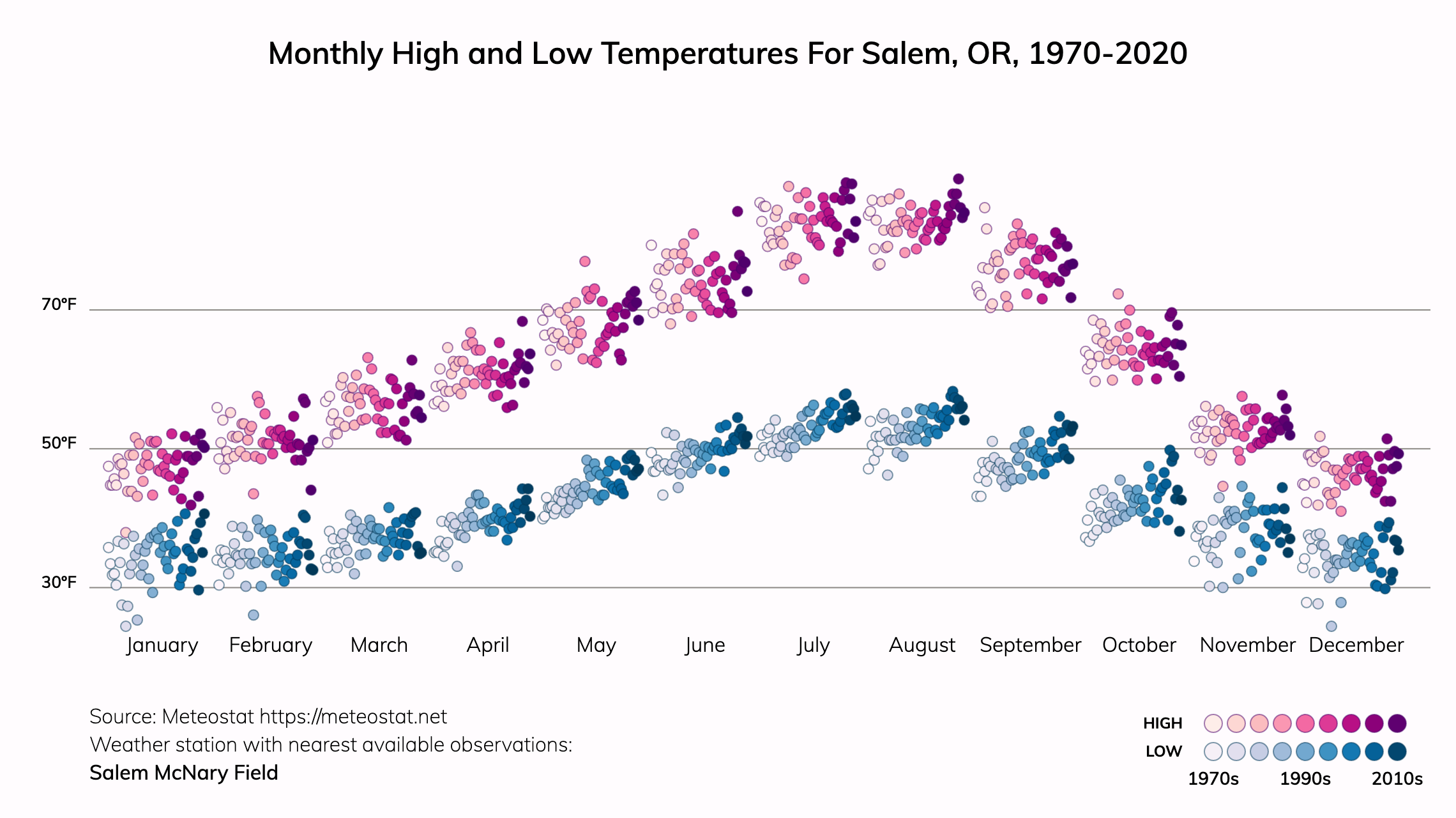 In a typical year around 1990, people in Salem, OR experienced about 7 days above 92.3ºF in a year. By 2050, people in Salem are projected to experience an average of about 24 days per year over 92.3ºF.Climate change is increasing the frequency and intensity of heat waves, even in places with cooler average temperatures. See more information on heat risk. Everyone can take steps to reduce their risks from extreme heat.