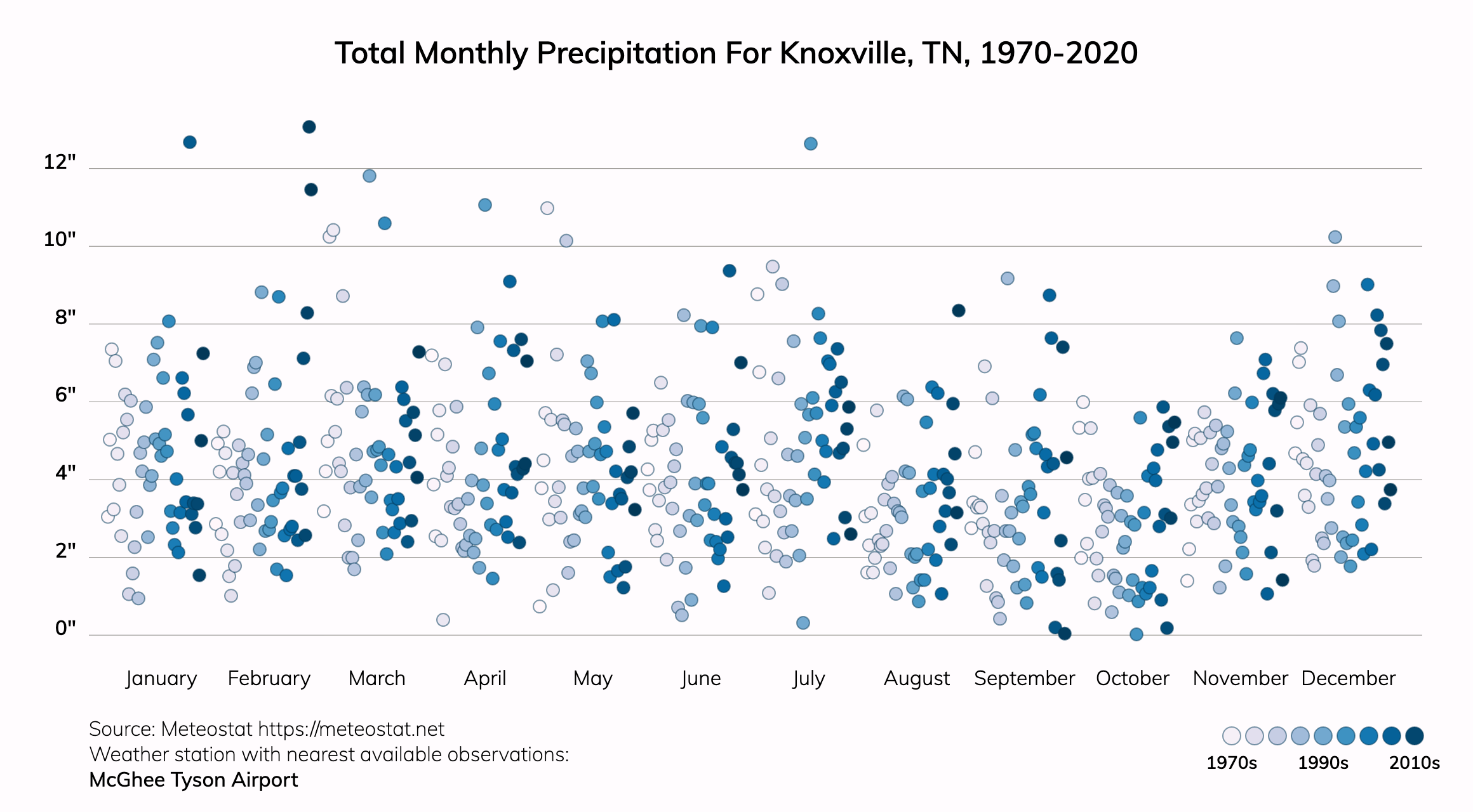 A downpour for Knoxville, TN is a two-day rainfall total over 0.9 inches. Around 1990, about 39.0% of precipitation fell during these downpours. In 2050, this is projected to be about 44.0%. The annual precipitation in Knoxville, TN is projected to increase from about 48.3" to about 51.4".Extreme precipitation in any form can pose significant risks. Climate change is increasing the potential for extreme rainfall or snowfall because warmer air can hold more water vapor. See more information on storm risk. Property owners can take steps to reduce their risks from extreme precipitation.