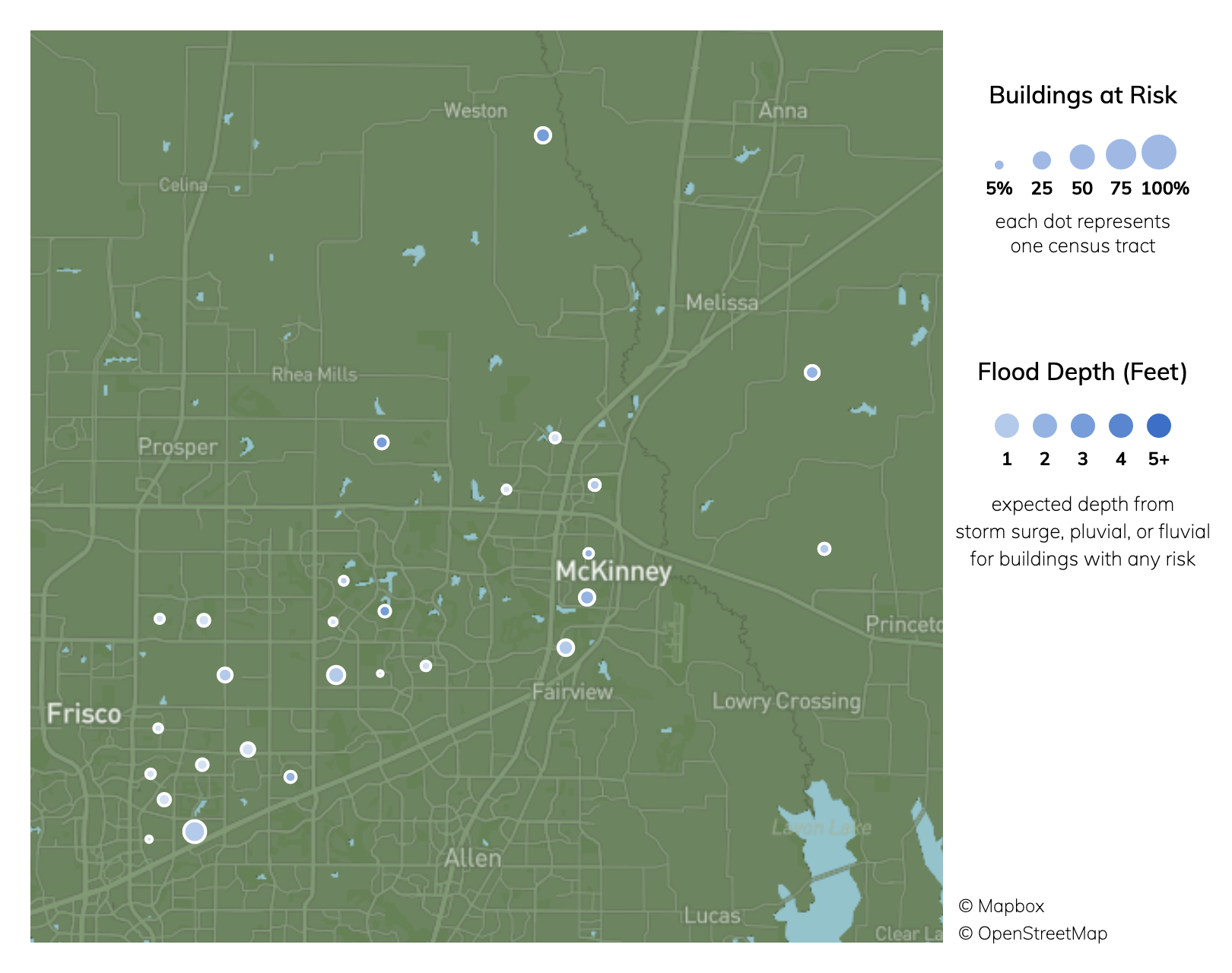 Of 65 census tracts in McKinney, TX, there are 2 where more than a quarter of buildings have significant risk from surface (pluvial) flooding and riverine (fluvial) flooding. Property owners can check a specific address for flood risk including FEMA flood zone, then take steps to reduce their vulnerability to flooding damage.Climate change is increasing inland and coastal flooding risk due to sea level rise and increasing chances of extreme precipitation. See more information on flooding risk.