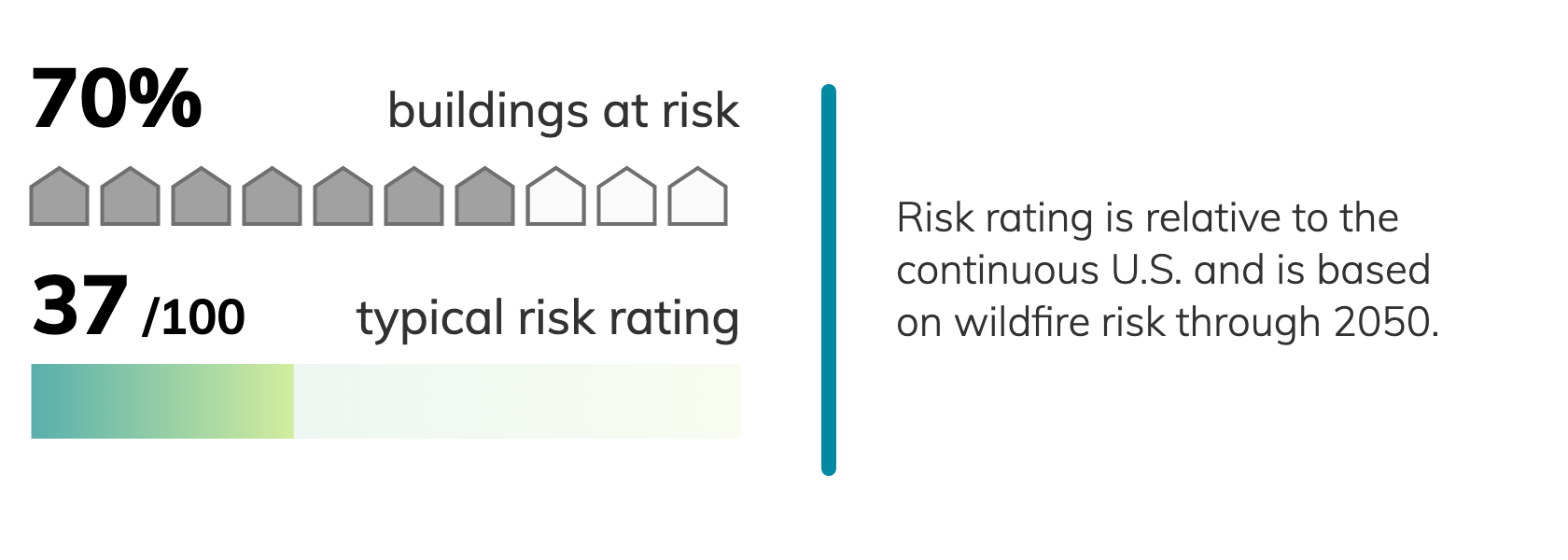 Of 65 census tracts in McKinney, TX, there are 57 where more than a quarter of buildings have significant fire risk, and 50 where more than half of buildings have significant fire risk. Property owners can take steps to mitigate their risks from wildfires.Fire risk depends on proximity to vegation: densely developed urban areas have a much lower risk of burning than areas adjacent to wildland. Climate change increases risks from wildfire by creating hotter, drier conditions for fires to spread. ClimateCheck ratings of fire risk are based on projected weather conditions and U.S. Forest Service models simulating fire behavior.