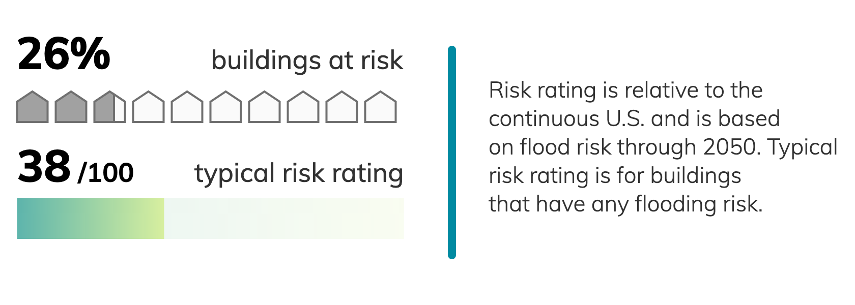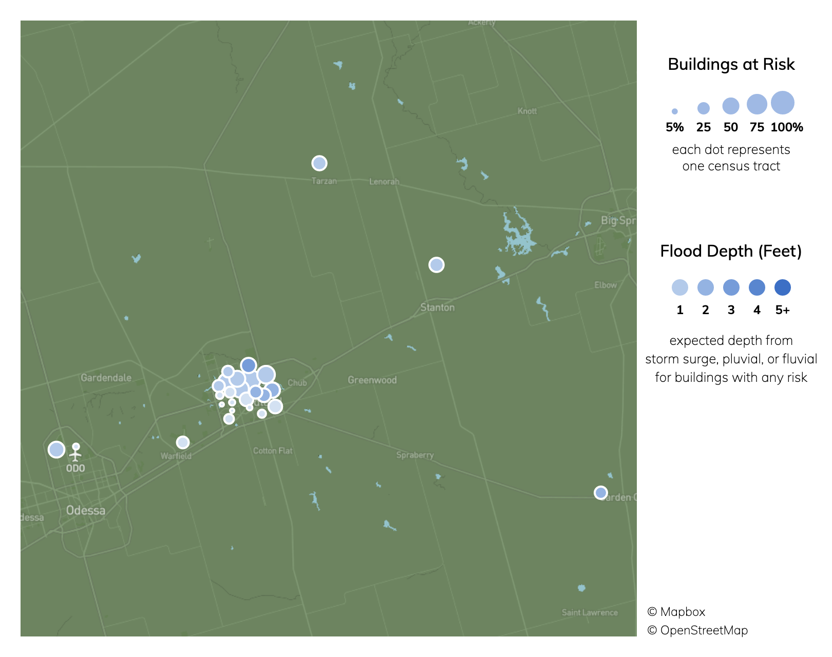 Buildings at risk in Midland average about a 40% chance of a flood about 1.1 feet deep over 30 years.