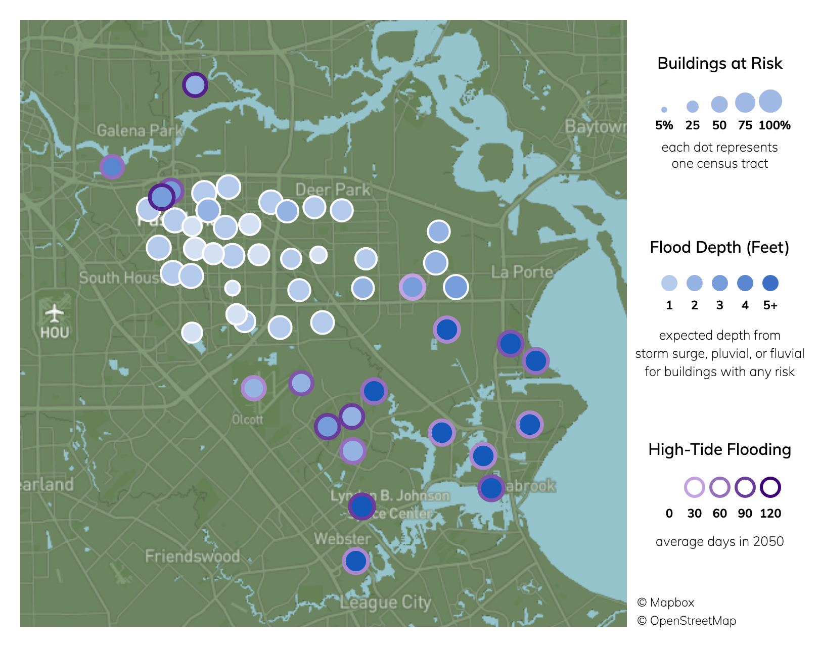 Of 95 census tracts in Pasadena, TX, there are 90 where more than half of buildings have significant risk from storm surge, high tide flooding, surface (pluvial) flooding, and riverine (fluvial) flooding. Property owners can check a specific address for flood risk including FEMA flood zone, then take steps to reduce their vulnerability to flooding damage.Climate change is increasing inland and coastal flooding risk due to sea level rise and increasing chances of extreme precipitation. See more information on flooding risk.