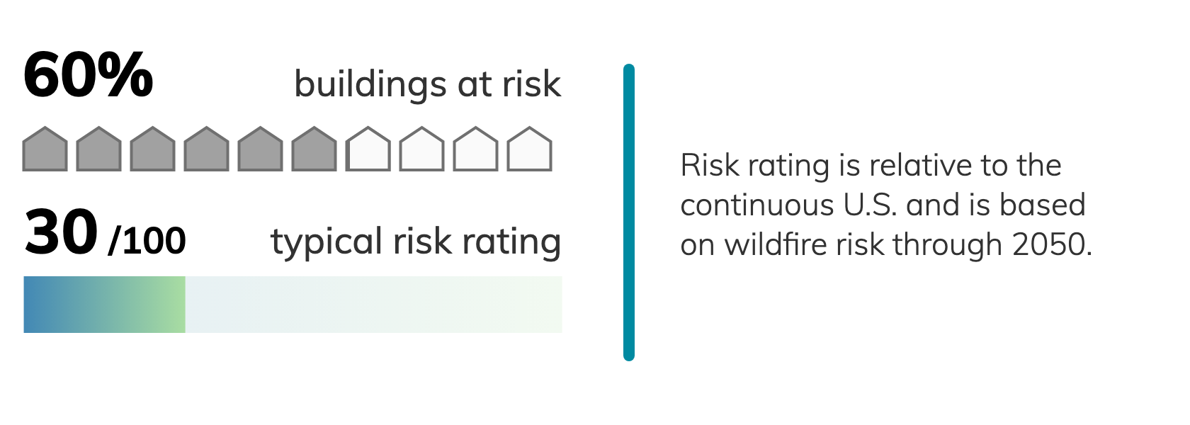 Of 95 census tracts in Pasadena, TX, there are 71 where more than a quarter of buildings have significant fire risk, and 53 where more than half of buildings have significant fire risk. Property owners can take steps to mitigate their risks from wildfires.Fire risk depends on proximity to vegation: densely developed urban areas have a much lower risk of burning than areas adjacent to wildland. Climate change increases risks from wildfire by creating hotter, drier conditions for fires to spread. ClimateCheck ratings of fire risk are based on projected weather conditions and U.S. Forest Service models simulating fire behavior.