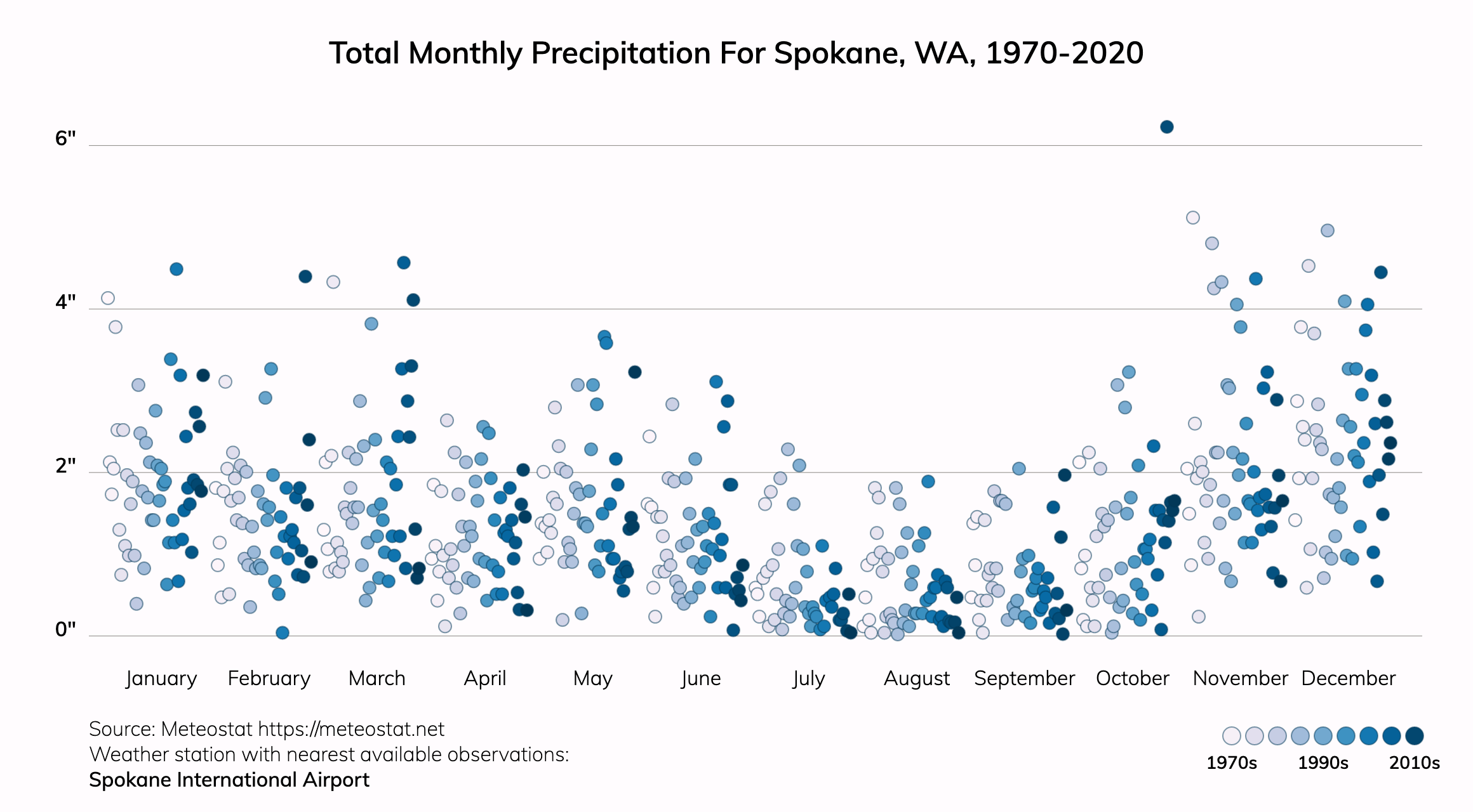 A downpour for Spokane, WA is a two-day rainfall total over 0.4 inches. Around 1990, about 43.0% of precipitation fell during these downpours. In 2050, this is projected to be about 48.0%. The annual precipitation in Spokane, WA is projected to increase from about 16.9" to about 18.3".Extreme precipitation in any form can pose significant risks. Climate change is increasing the potential for extreme rainfall or snowfall because warmer air can hold more water vapor. See more information on storm risk. Property owners can take steps to reduce their risks from extreme precipitation.